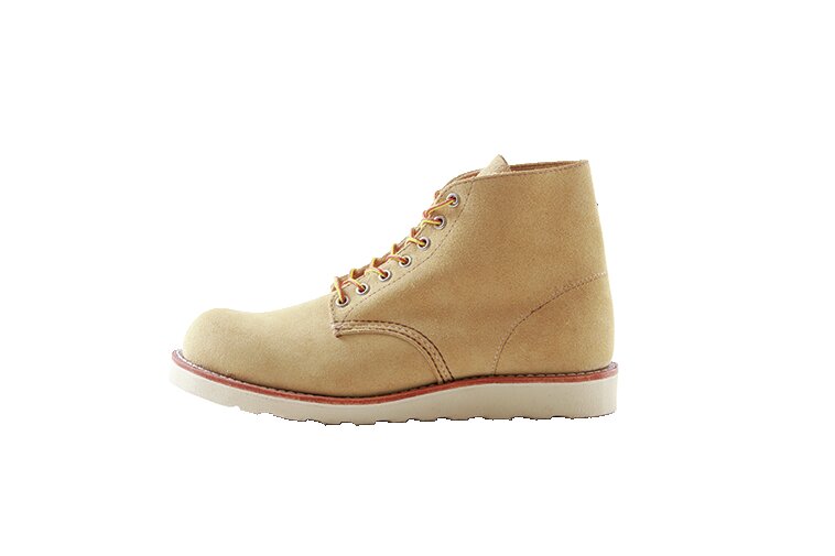 レザーの起毛面を薄くスライスしてつくるいわゆるスウェードと異なり、レザーの繊維密度が最も高い部位である銀面を内側に起毛面を表面として使うラフアウトレザー。アウトドア用として多く使われていたタフなレザーを使用したラウンドトゥ。