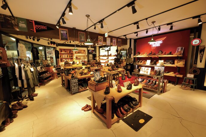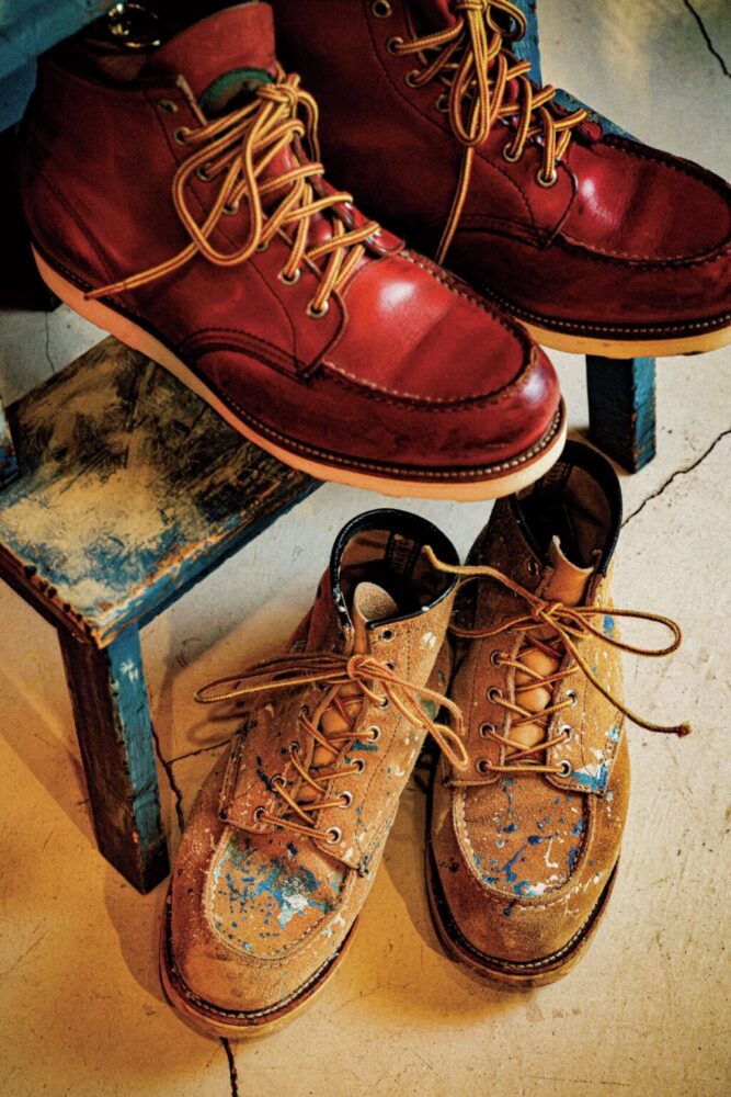 店内にレイアウトされているエイジングサンプルはリアルにブーツを愛するスタッフたちによって着用されてきたもの。写真左の「875」は段ノ上氏が20代の頃に購入したという年代物のRED WINGなのだとか。