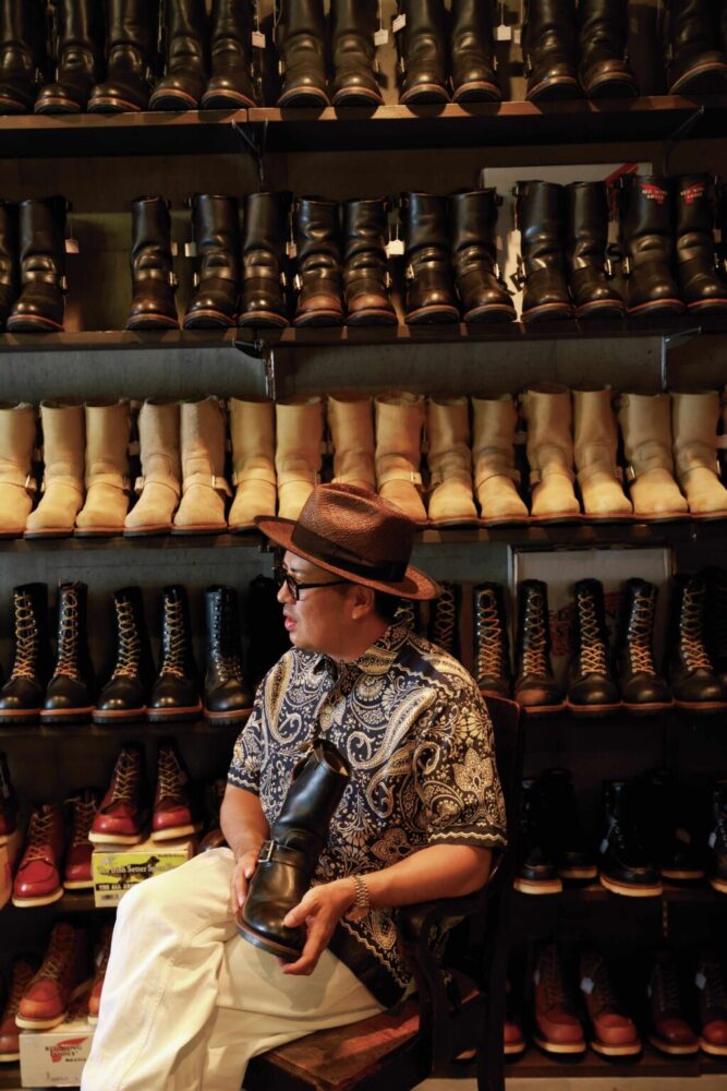ブーツ好きが高じて専門店をオープンし早20年。オーナーである福嶋氏がこだわり続けたショップは、いまや日本のみならず世界のブーツファンが訪れる東京の名店として知られるようになった。彼が初めて手に入れたRED WINGは高校生の時に手に入れたエンジニアブーツ。さすがに当時物は手元には残っていないようだが、現在愛用しているブーツも購入してからかれこれ25年が経過しようとしている。