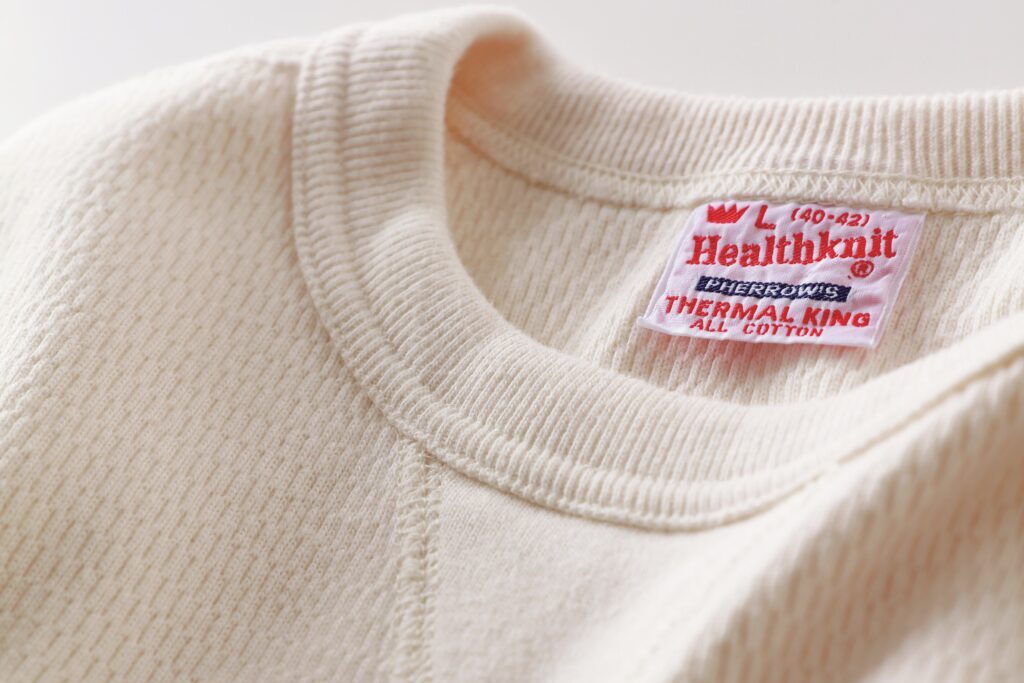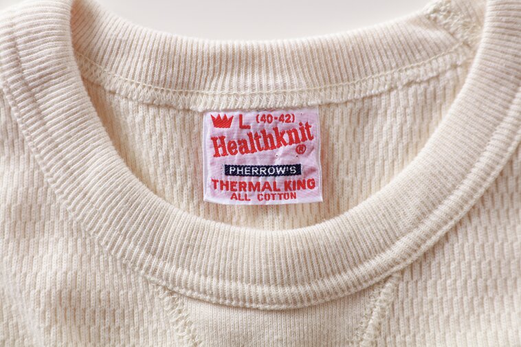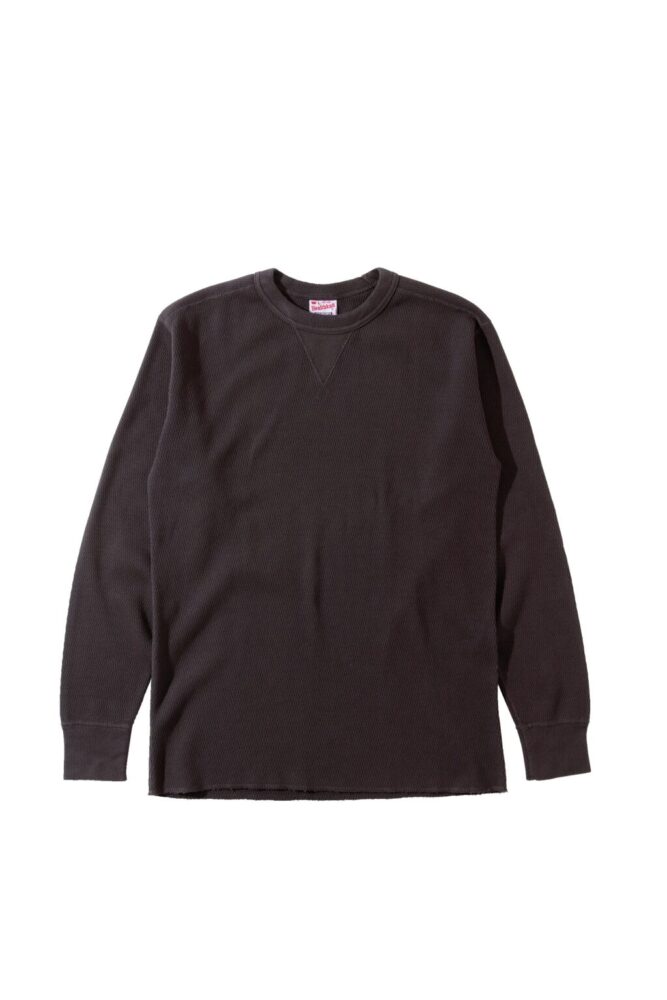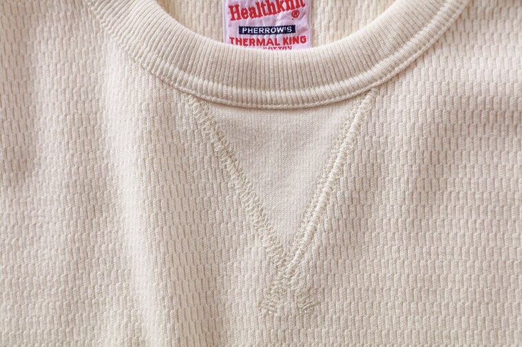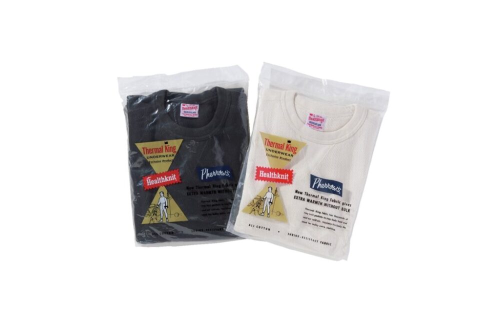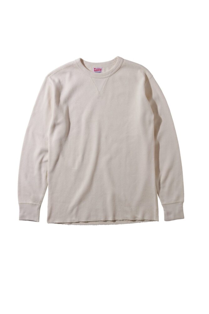 ヴィンテージを解析し、特注糸から作り上げた肉厚なワッフル生地は、保温性、吸水性に優れ、着用ごとにふんわりと肌へと馴染む特有の経年変化が楽しみな1枚。ヴィンテージサーマル同様タイトなフィッティングに設計されているため、当然インナーとしても活躍必至だが、肉厚な生地であることから1枚でコーディネイトしてもサマになる。パッケージデザインは1960年代の当時のデザインを再現している。¥15,180_