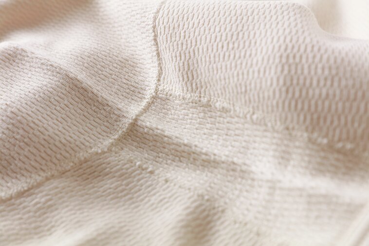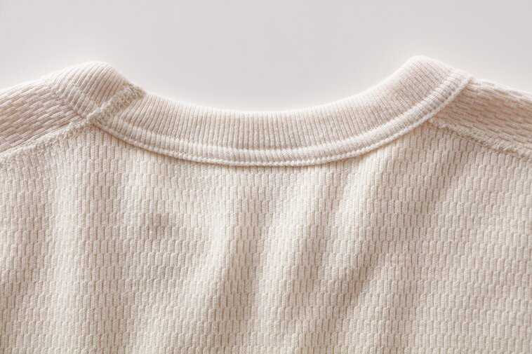ヴィンテージと同じく裾はロック処理が施されるのみ。肩部分に1枚パーツが付けられており、伸縮性、機動性を考慮された立体的なデザインとなっている。このコラボレーションの大きな特徴であるVガゼット。1960年代のスポーツウエアを代表するディテールのひとつだ。Wネームの織りタグやバインダーネック、リブもクラシカルな作り。