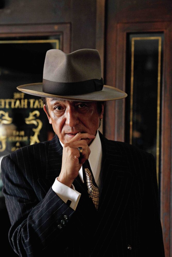 特注ポルトガル産ラビットファーのドレスハット。40年代のアメリカンマフィアをイメージし、38mm幅のトリプル&ダブルウィングバック仕様のリボンで力強い印象に。