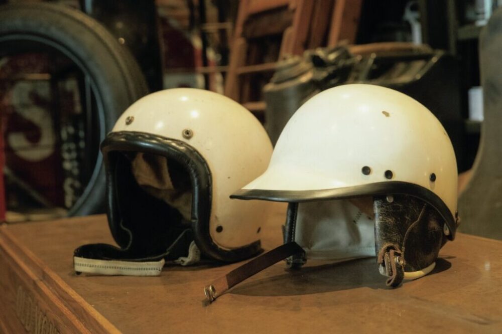 ヘルメットはヴィンテージMchalのオープンフェイスタイプ(左)と現行Mchal CLUBSTERがフェイバリット。近々、Mchal Japanとコラボレーションモデルを発売予定。