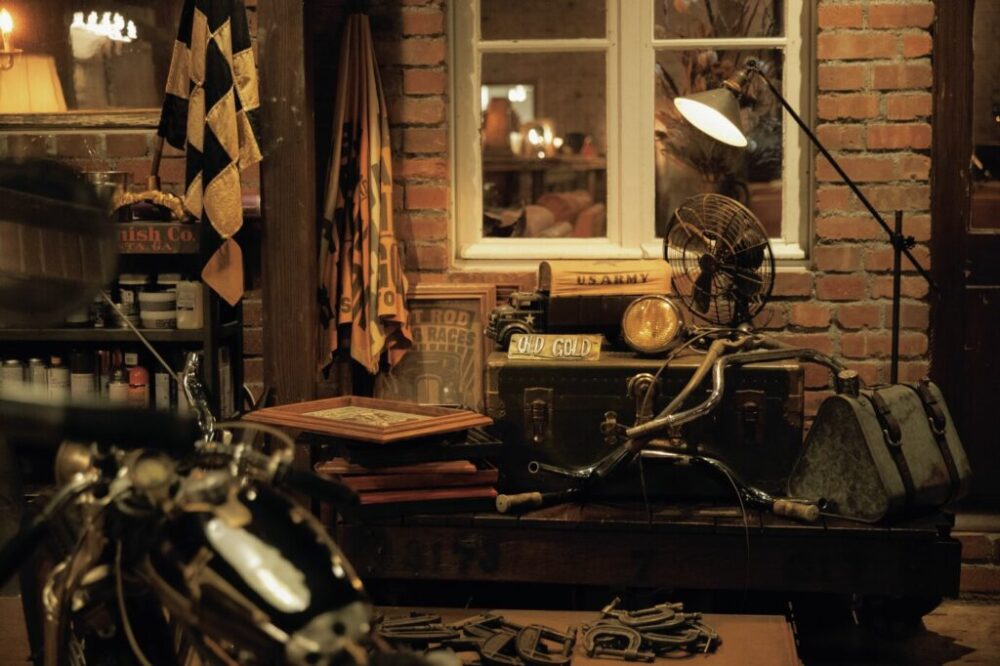 アウトドアギアや乗り物だけでなく、インテリアや照明、音響など様々なヴィンテージのコレクションがガレージに並ぶ。現代のモノ作りの背景では非効率なデザインやディテールなど、ヴィンテージプロダクツのモノ作りがオールドマウンテンのプロダクツに反映される。
