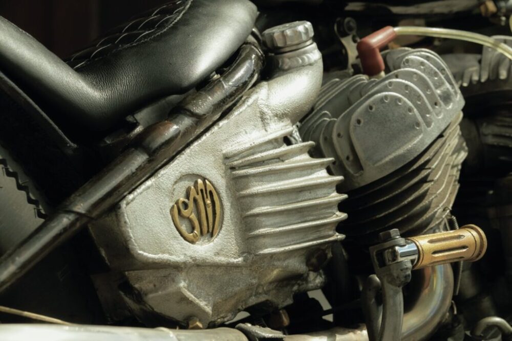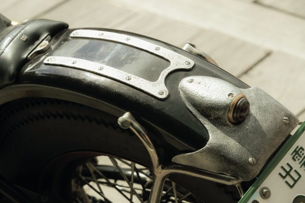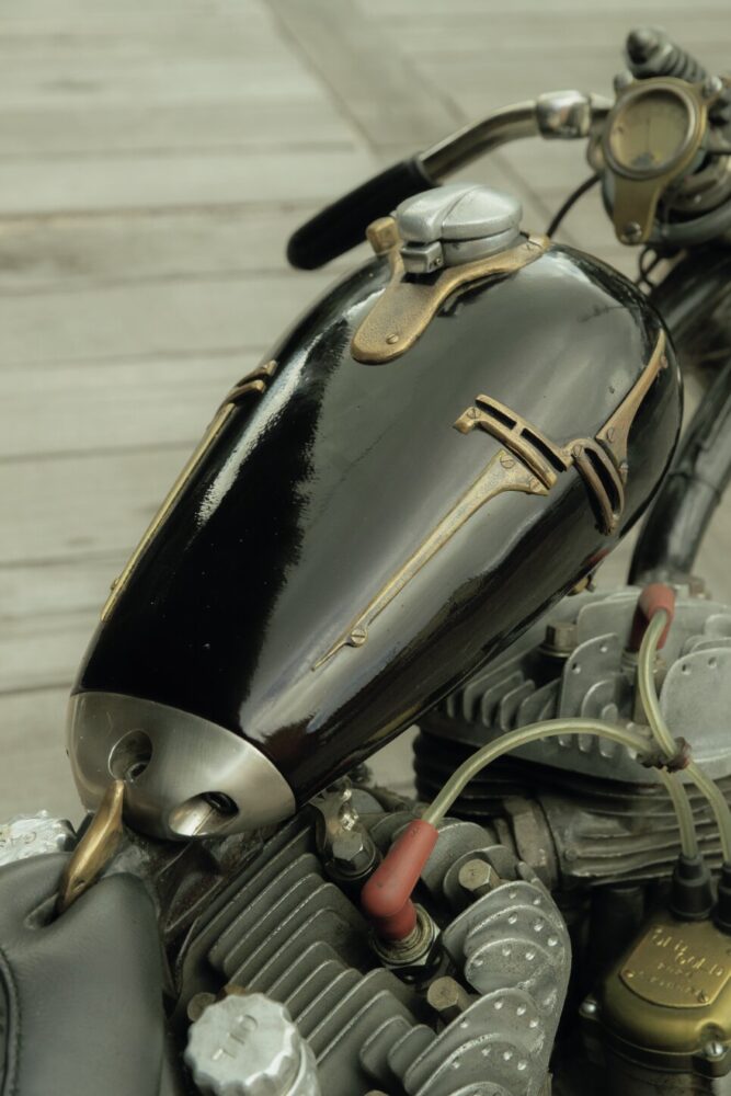 “OLD GOLD”は辻ノ内が衝撃を受けた30年前の木村氏の名作のオマージュだが、味わい深いメタルワークが光るワンメイドの外装やブラスパーツのアクセントなど、いまの木村氏の技術とセンスによって唯一無二のカスタムに仕上げられている。