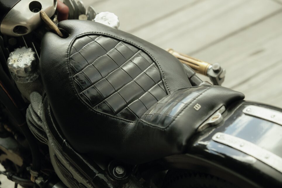 手作業のメタルワークによる有機的な造形美が木村氏のカスタムビルドの真骨頂。シート下は右側にオイルタンク、左側に1ガロンの予備ガスタンクを装備。シートはLEATHER ARTS & CRAFTS MOTOの本池氏によるワンメイドで、センターにクロコダイル、その周囲にクードゥレザーを採用。辻ノ内氏がリスペクトする職人の技術が融合したカスタムなのだ。