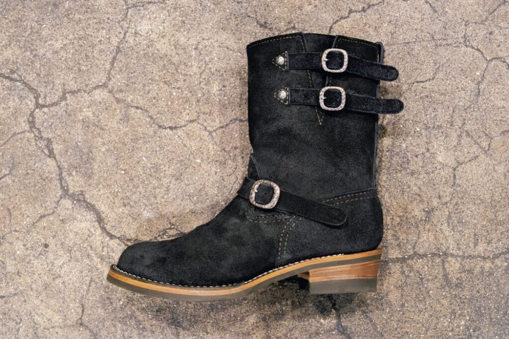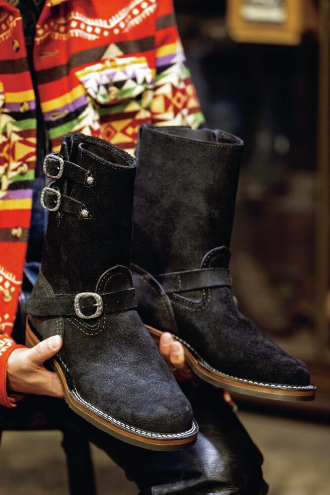 WESCOでは定番として使用されているヒール高の高いブーツ用の「9165」ラストを採用。アッパーには足馴染みが良いと人気のマテリアルであるオイルドラフアウト。シャフトを細くし、ヒールをやや高めに設定することでスタイリッシュな印象に仕上がっている。大きな特徴としては、熊谷氏のライフスタイルの一部となっているヴィンテージナバホから着想を得たバックルデザイン。ベルトの長さも上が2インチ、下が1インチと長めに設定。¥490,000_