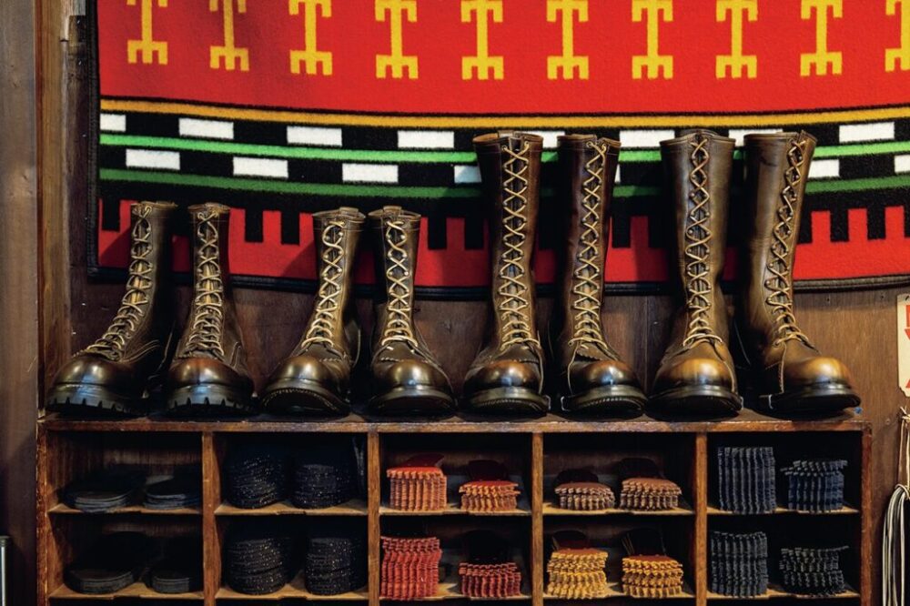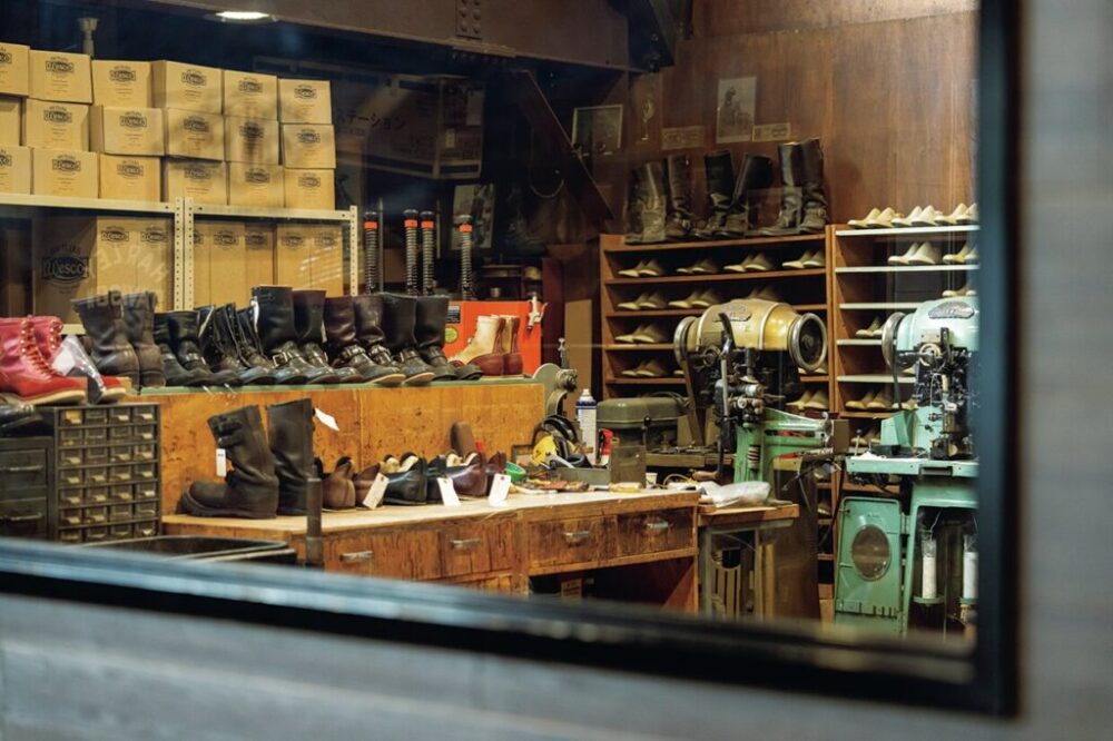 店内奥のウィンドウ越しに見えるのは、ブーツのリペア工房。ソール交換など、リペアを希望するブーツたちが全国からここに集まってくる。
