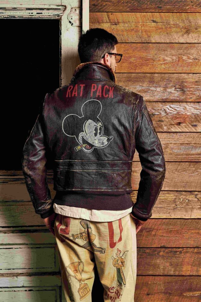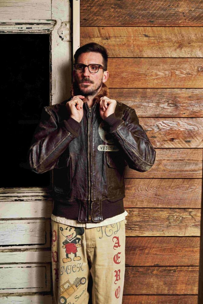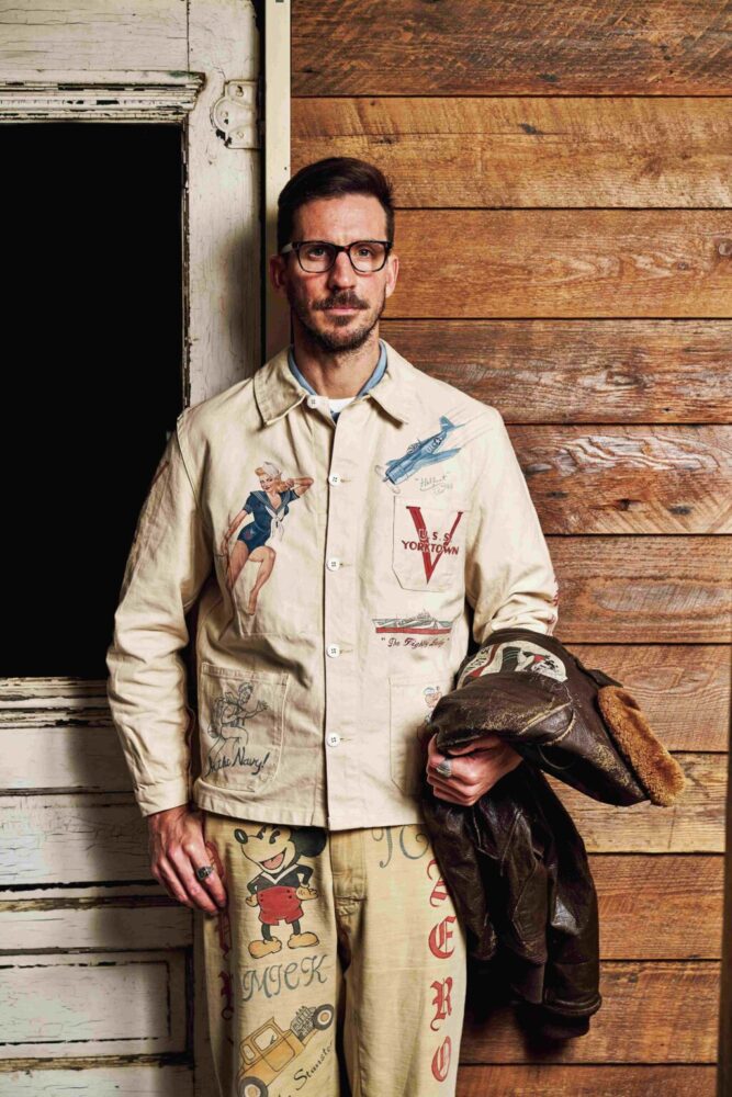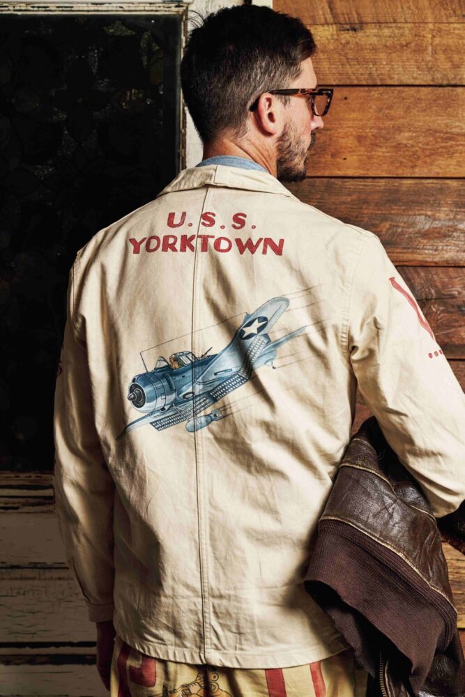 かつて、アメリカ海軍の兵士がしていたように、自らのチョアジャケットに色彩豊かな、しかも年代を感じさせるカスタムペイントを施した。実在した空母の名前、艦載機、さらにはピンナップガールと、稀有なヴィンテージピースのように見せるのも彼の技量があるからこそ。