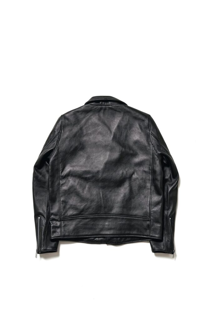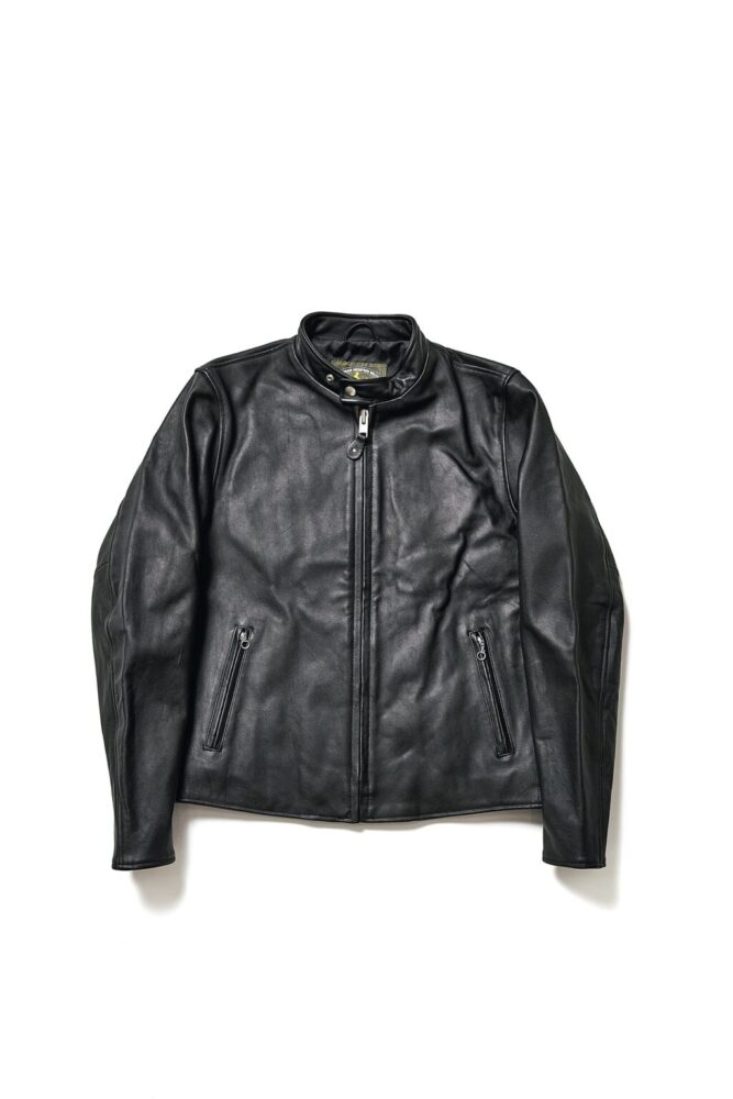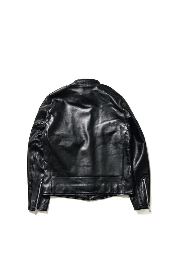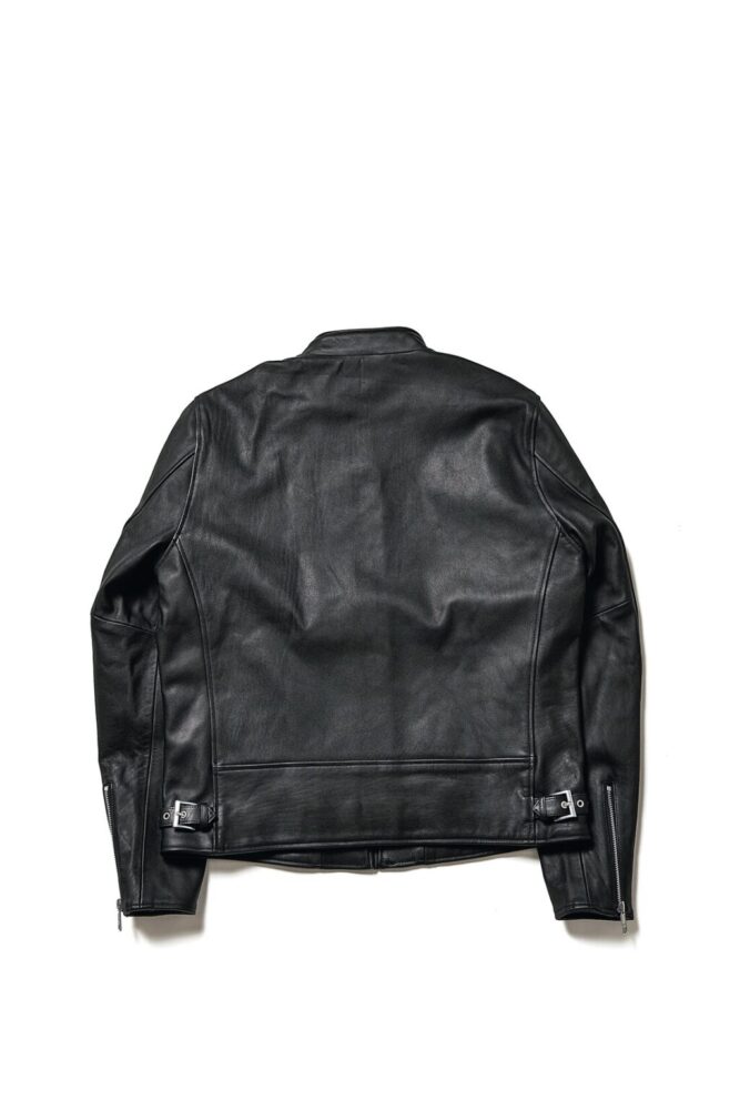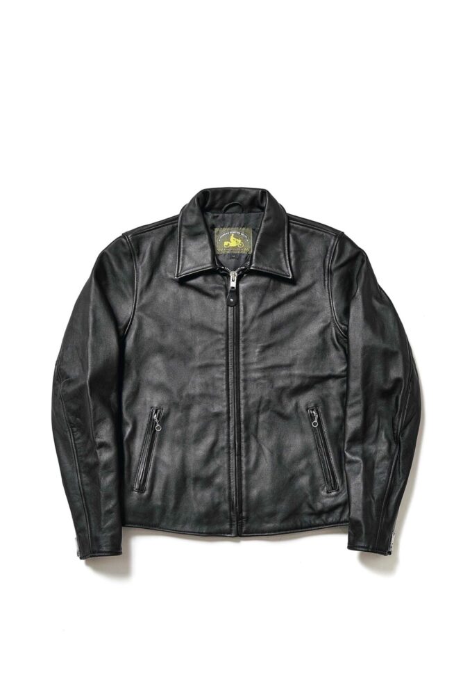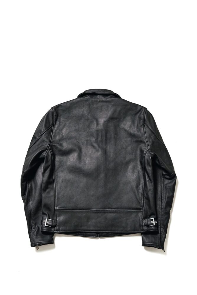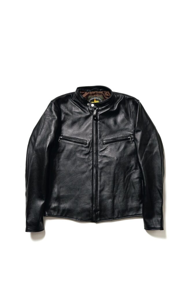 1950年代に見られる王道のライダースジャケットをモチーフにしたモデル。袖口は定番のジッパー仕様で、背面は贅沢に一枚革を使用している。素材にはしなやかな軽量のラムスキンを使用しており、革ジャン初心者の方でもストレスなく着用することができる。アクションプリーツがないため、着てみると身体にフィットして非常にスタイリッシュ。とはいえ、袖付け部分のパターンを改良しているため、前傾姿勢も取りやすい。48,000円