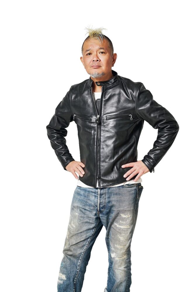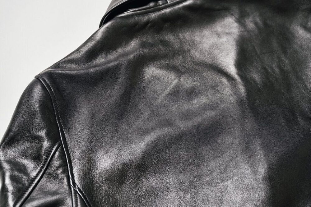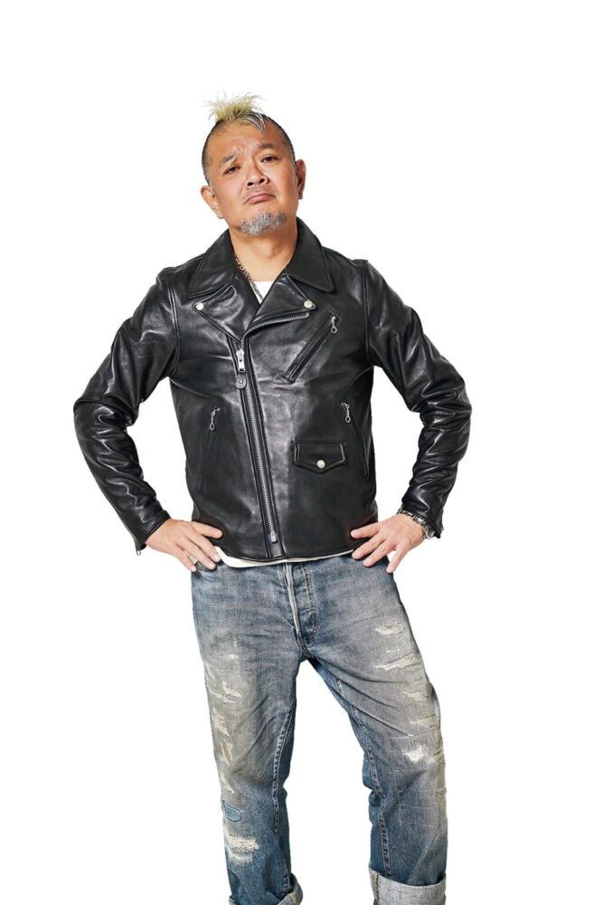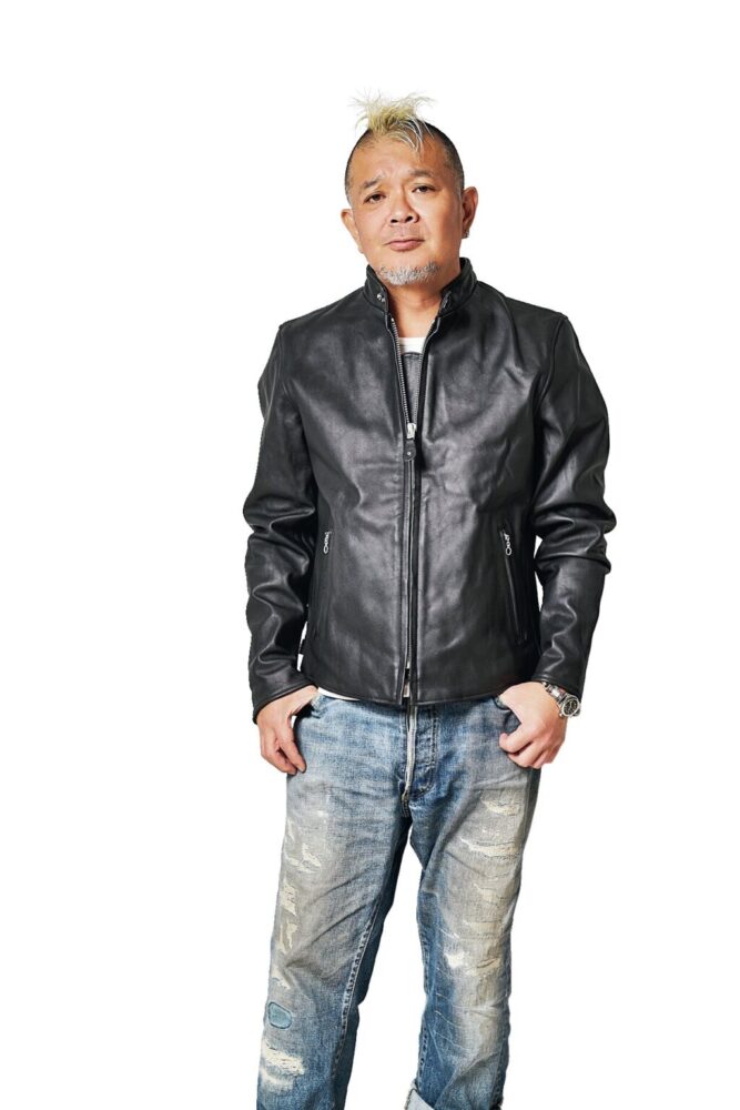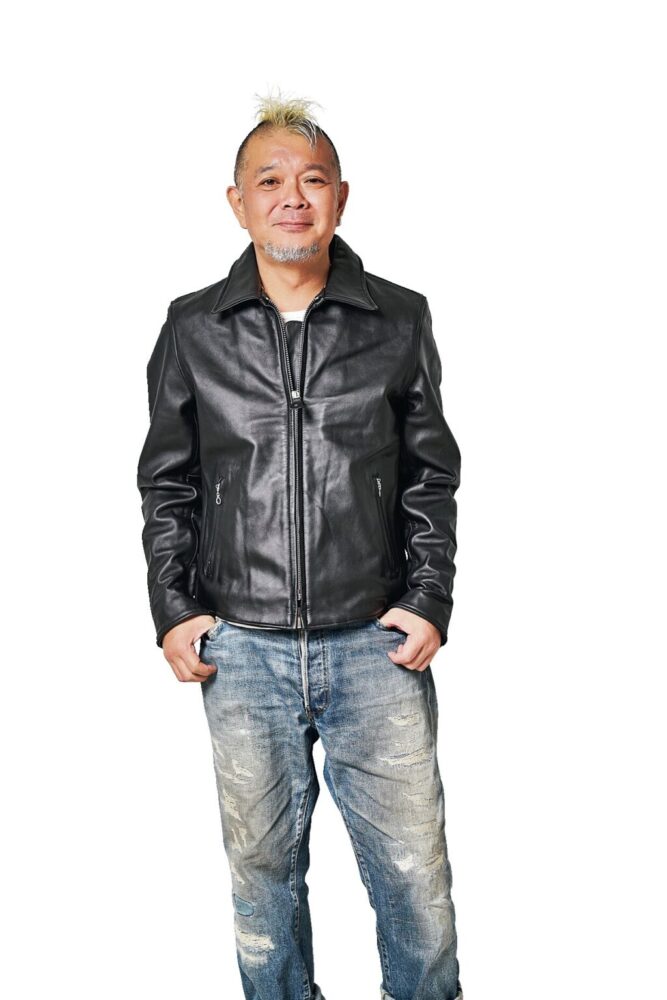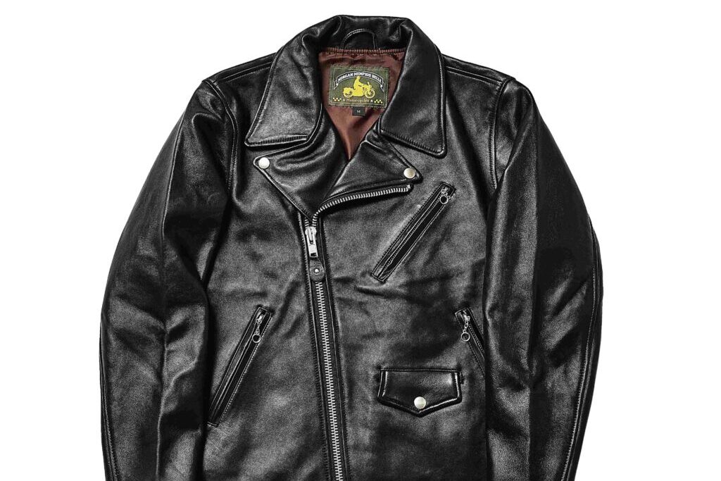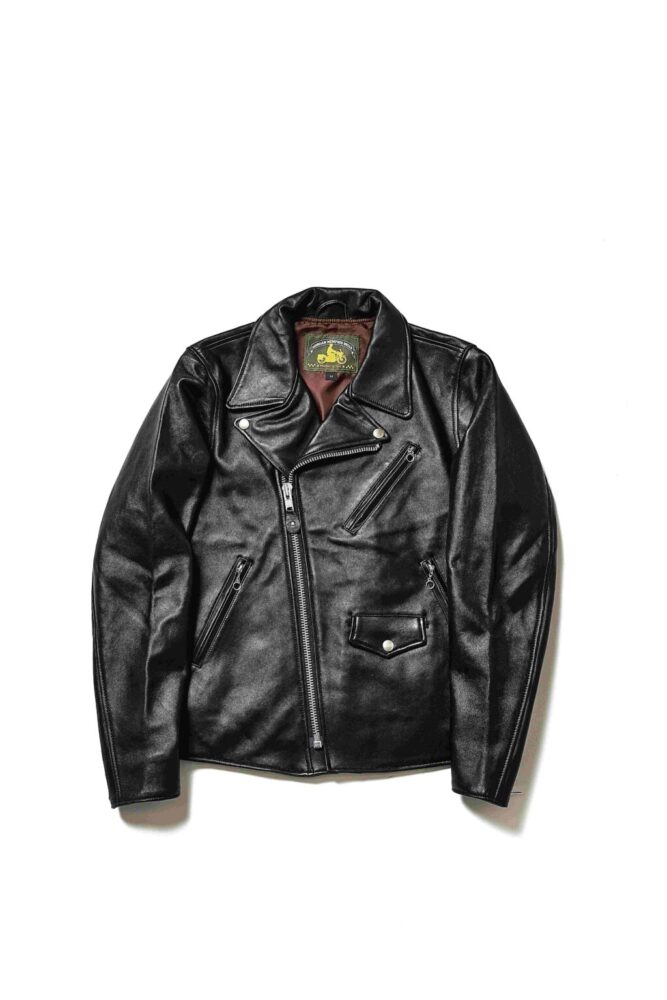 1950年代に見られる王道のライダースジャケットをモチーフにしたモデル。袖口は定番のジッパー仕様で、背面は贅沢に一枚革を使用している。素材にはしなやかな軽量のラムスキンを使用しており、革ジャン初心者の方でもストレスなく着用することができる。アクションプリーツがないため、着てみると身体にフィットして非常にスタイリッシュ。とはいえ、袖付け部分のパターンを改良しているため、前傾姿勢も取りやすい。48,000円
