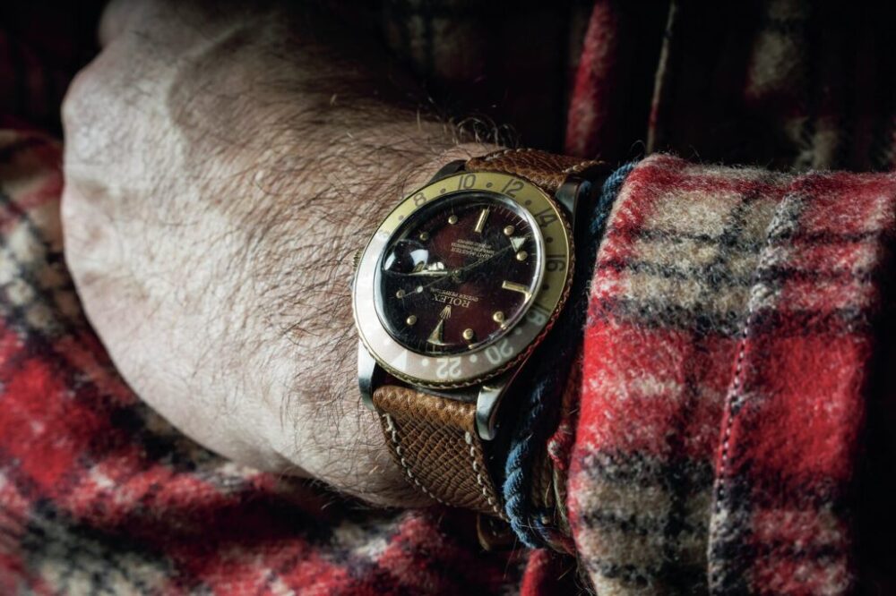 ヴィンテージウォッチ愛好家としても知られる。この日はROLEXのGMTマスターのRef.16253を愛用。フジツボ仕様のルートビアダイヤルが◎。