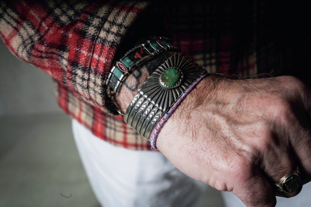 アクセサリーは、ヴィンテージかと思いきや、ネイティブアメリカンのナバホ族のアーティストへオーダーしたバングルである。