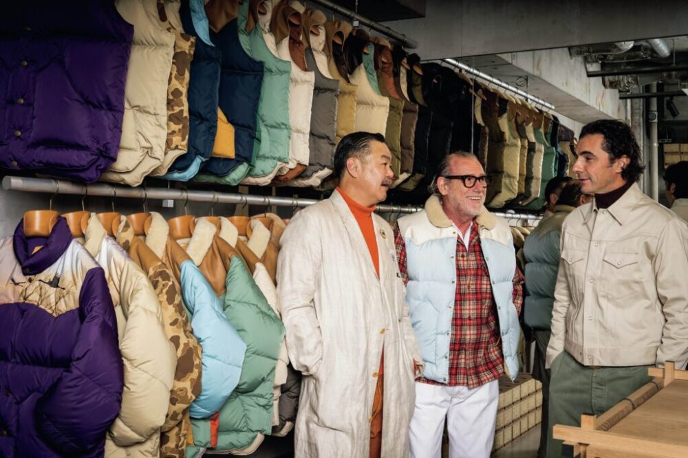 10年以上の友人である35SUMMERSの寺本欣児さんとアレッサンドロのビジネスパートナーであるマテオとの3ショット。アーケオス クラブ 銀座の1周年イベントとしてアレッサンドロの私物ヴィンテージの販売とFORTELAのポップアップを開催した。アレッサンドロも接客対応をしていた。