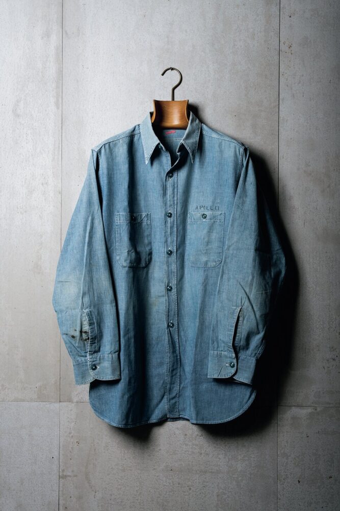 アレッサンドロのアイコンでもあるシャンブレーシャツは、US NAVYのヴィンテージ、何枚も所有しているが、コンディション重視ではなく、エイジングされたものを好む。