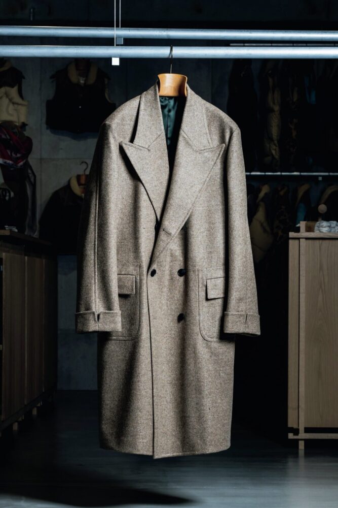 大きなピークドラペルが際立つダブルブレストコートは、クラシックなヘリンボーンツイードを使用。テーラードを十八番とするナポリのファクトリー製。¥297,000