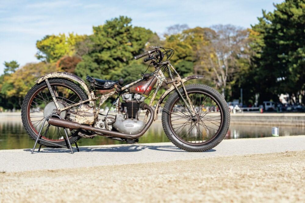 津島天王川公園のオートレースに参戦していたT80レーサー。オリジナルのT80はプランジャーサスフレームにテレスコピックフォーク、フットシフトだが、この車両はエンジンも含め全てレース仕様にモディファイされている。 神奈川県のテッズスペシャルで本来の性能を引き出すレストアが施された車両で、華奢なリジッドフレームやデュアルチェック・スプリングのガーダーフォークなど、英国車らしい装備が多く見られるのも特徴だ。