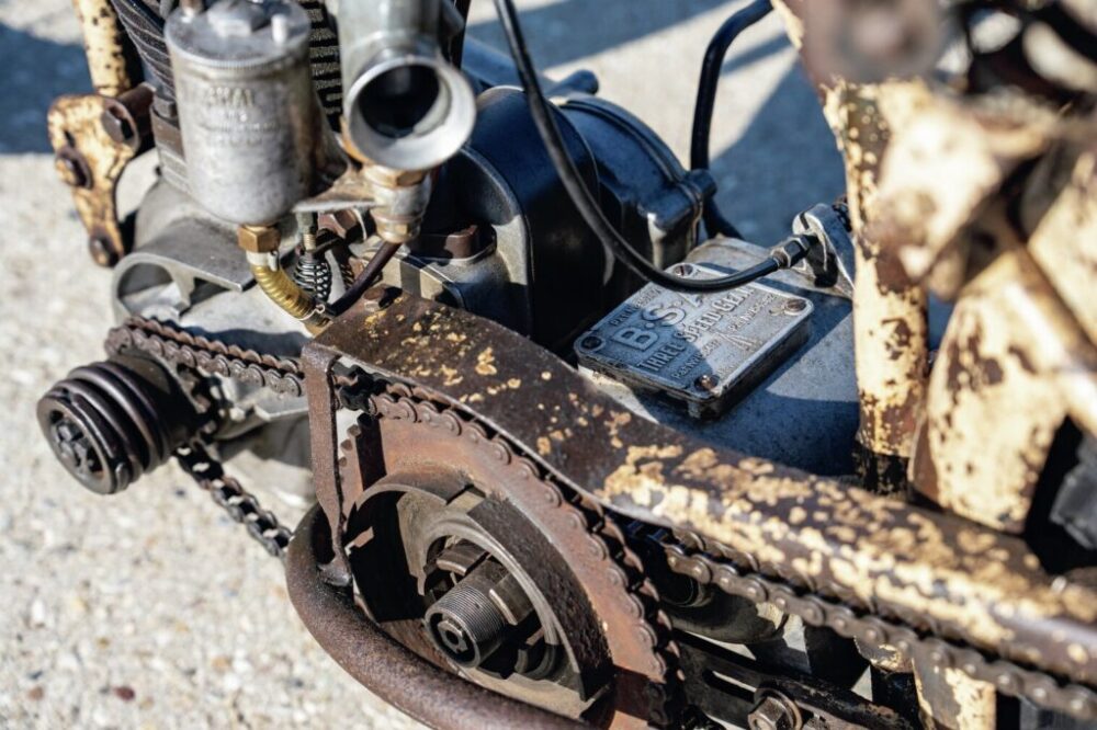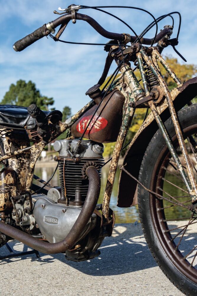 トリコロールカラーのデュアルスプリングに対して、こちらはシングルスプリングのガーダーフォークを装備し、19インチ・フロントウィールはスプールハブのブレーキレス仕様。トランスミッションはツバサのオリジナルが頼りなかったのか、BSA用を2速にモディファイしている。