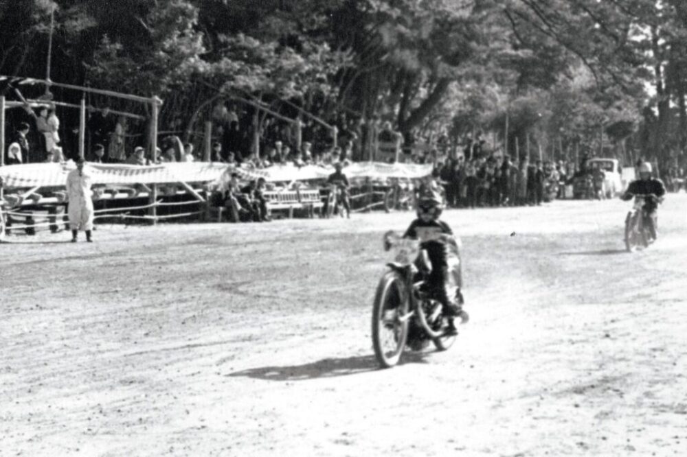 戦争中、レースは中断を余儀なくされるが、敗戦から3年後の48年に競輪法が成立し、翌年には戦後最初のオートレースと言われる『日米親善・全日本モータサイクル選手権大会』が多摩川スピードウェイで開催された。このレースは日本小型自動車工業会が、政府に働きかけ公営ギャンブルレースを立法化することによって、その収益でバイク業界を盛り上げることを目論む大きな動きであった。