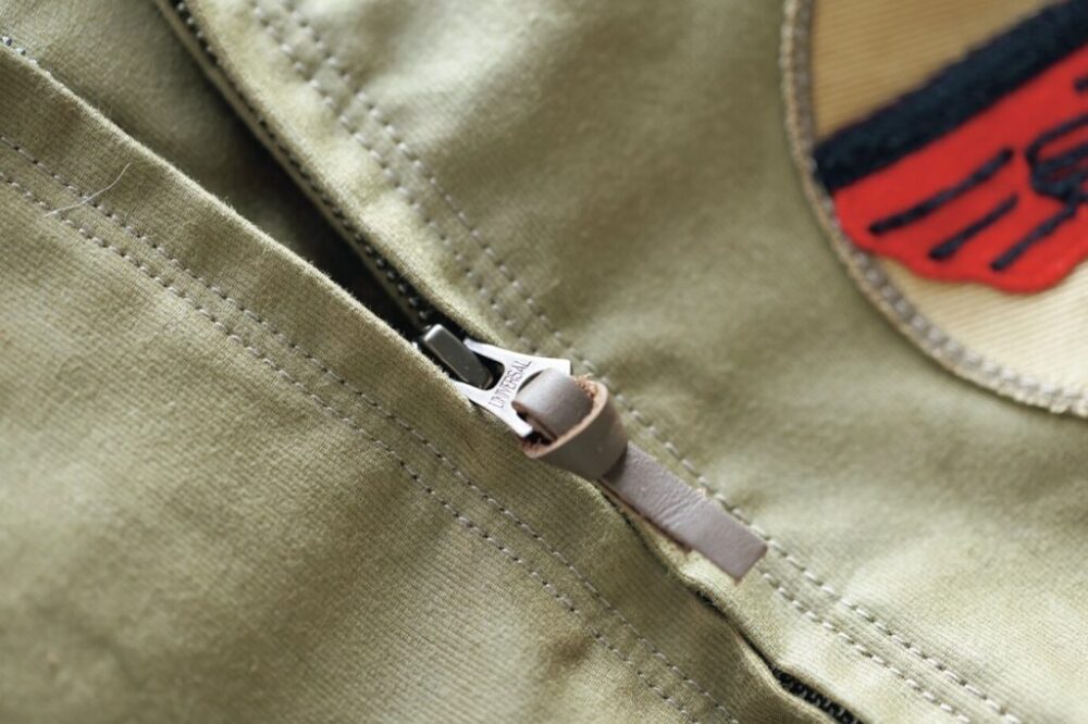 フロントファスナーにはレザーの引き手が付けられ、着脱しやすさはもちろんクラシカルな雰囲気が一段と増している。