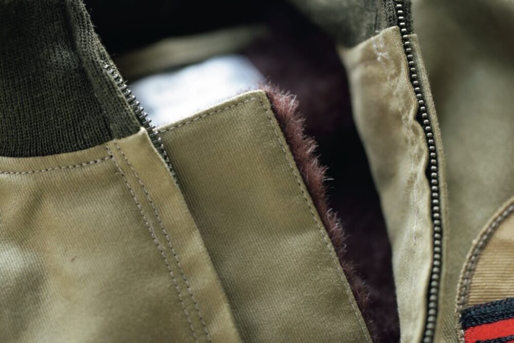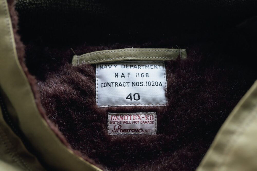 ファスナーのある前立て部分から、風の侵入を防ぐため、裏にはウィンドフラップが採用されている。最初期のデッキジャケットに採用されたものと同じく、裏地にはアルパカ混のウールライニングが装備されており、防寒性を高めている。
