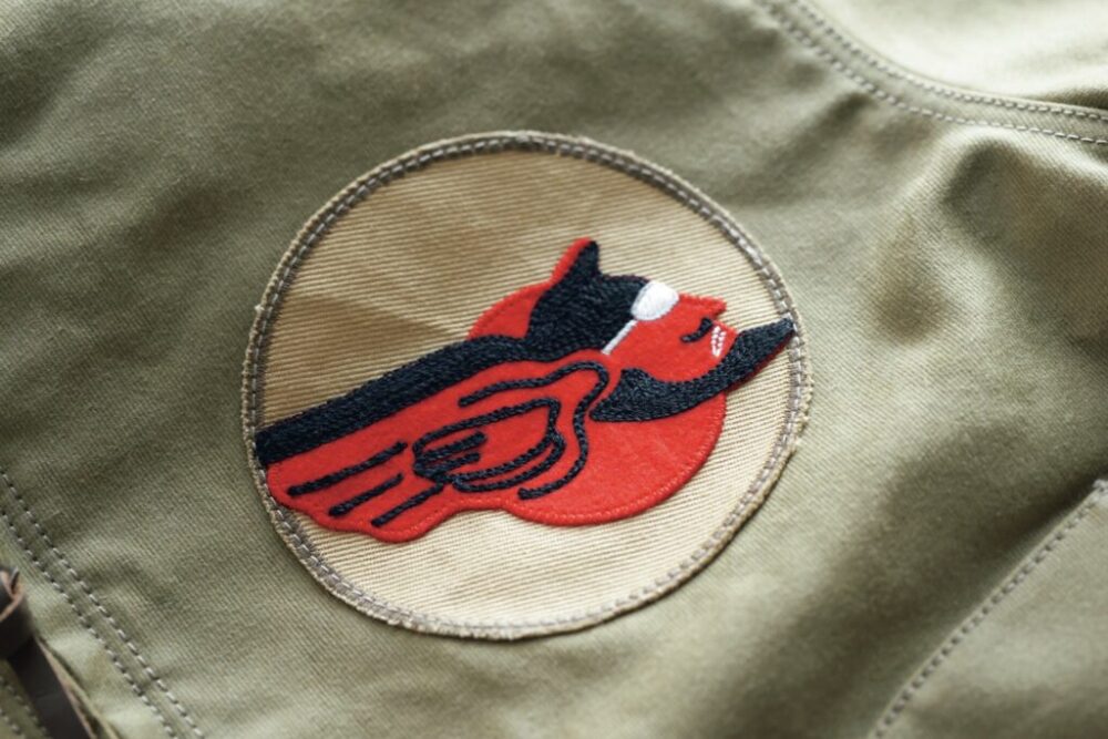 左胸には、中隊への所属を示すハンドメイド感のあるスコードロンパッチが付けられ、シンプルなデッキジャケットに彩りを添えている。