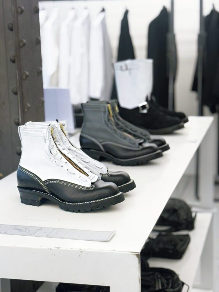 2026年1月下旬、ヨウジヤマモトプールオム パリ展示会。世界中のファッショニスタが一同に介するPFW(パリファッションウィーク)、この期間中にヨウジヤマモト プールオムの展示会は実施された。世界中のバイヤー、ジャーナリストたちが期間中、真新しいプロダクトを求めショールームへと足を運ぶ。その中でウエスコブーツの持つオーラに引き寄せられた結果、多くの関係者が足を止めて見入っていた。その最大の理由は、白く輝くホワイトレザーの存在だろう。