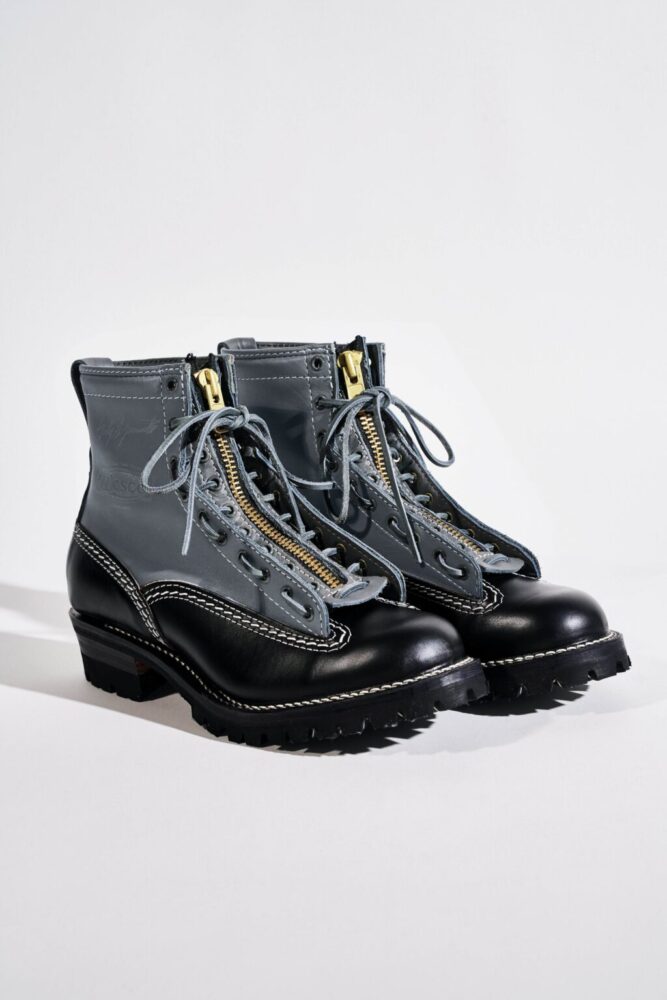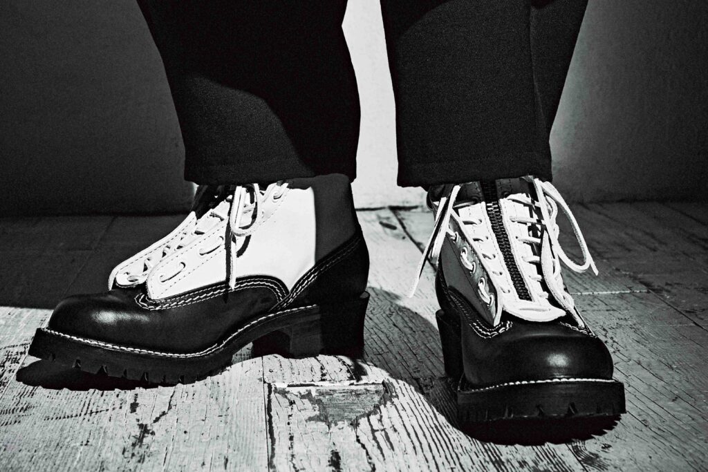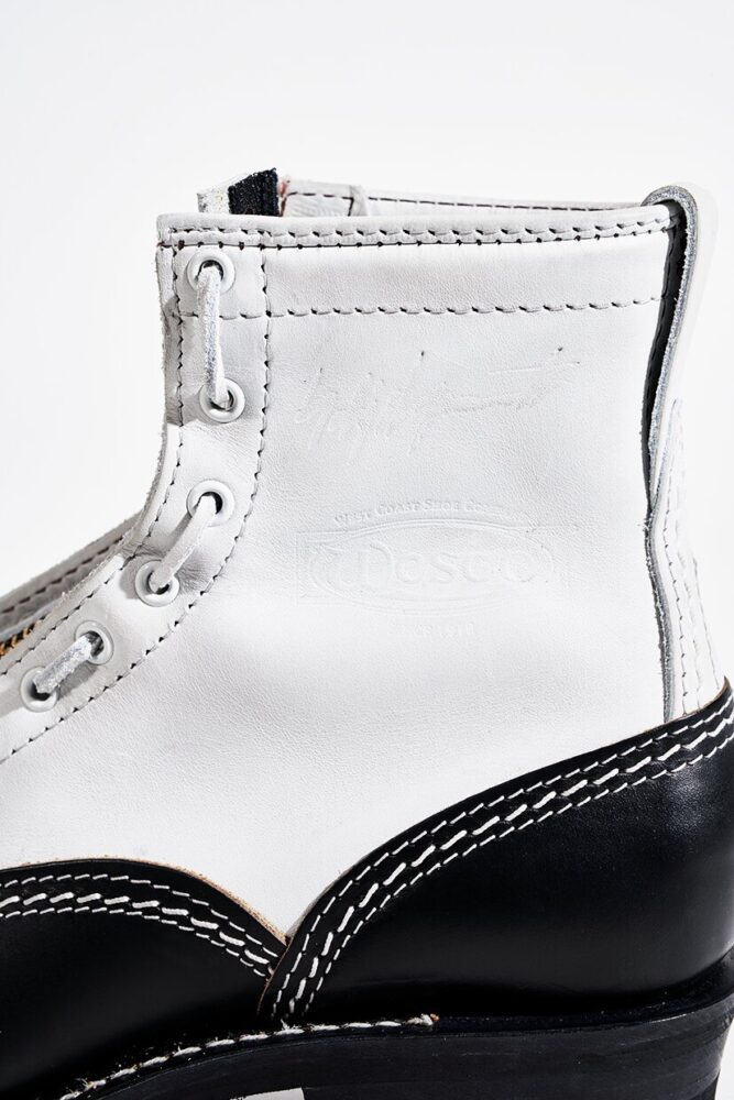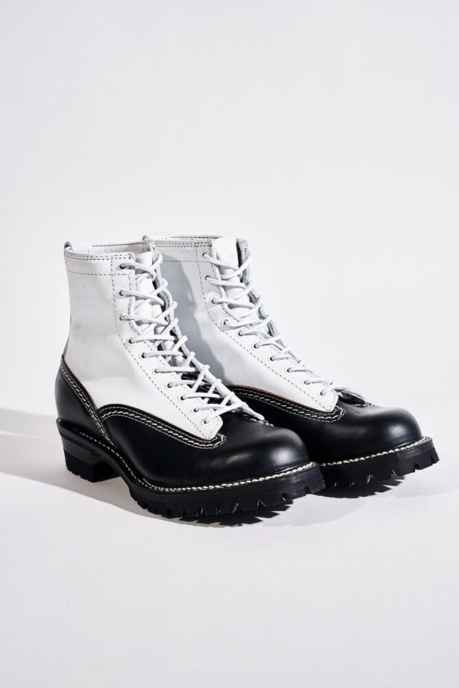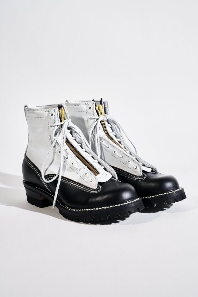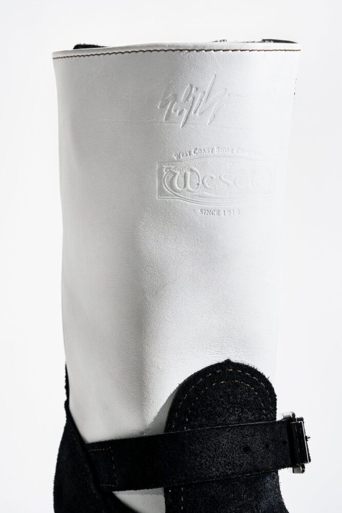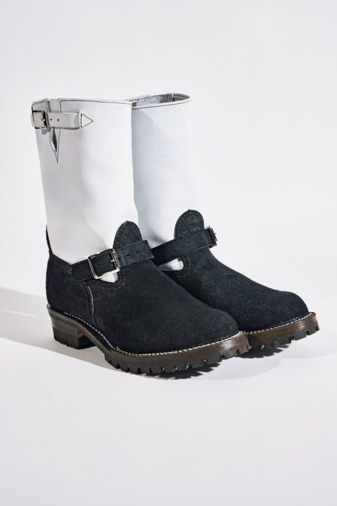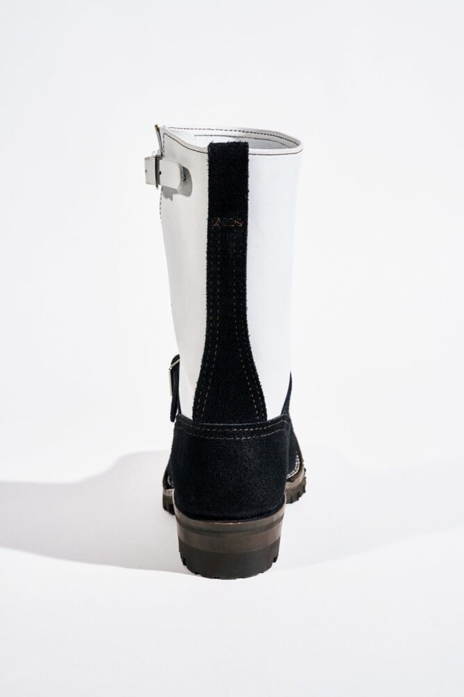 北米ではヘビーワーカーから、日本ではモーターサイクル・ラヴァーから絶大な信頼を得るキング・オブ・エンジニアブーツ、THE BOSS。前述のJOBMASTERと同様に、本モデルもヨウジヤマモト プールオムのために製作したホワイトレザーを採用したのが最大のポイントだ。ヴァンプ・カウンター・インステップストラップ・バックステーはブラックラフアウトのホースレザー、シャフト・ガセット・トップストラップはホワイトカラーのカウレザーで仕上げた。ストラップバックルにはヴィンテージ調のニッケルメッキローラー、つま先はボストゥ、ミッドソールはシングル、アウトソールはVibram♯100、10インチハイト、Dワイズで仕上げてある。