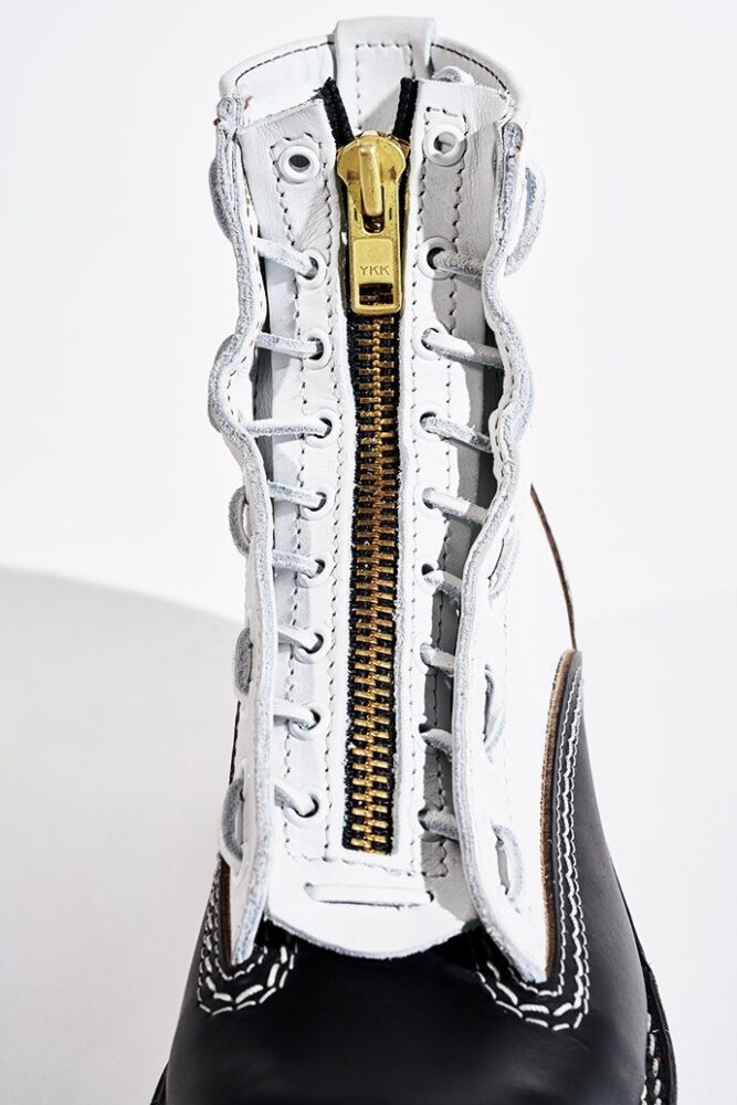 レースインジッパーを外してプレーンな状態での着用も可能。アッパーのアイレットもホワイトで仕上げ、コバ、ステッチもホワイトを使用することで一体感のあるデザインに。