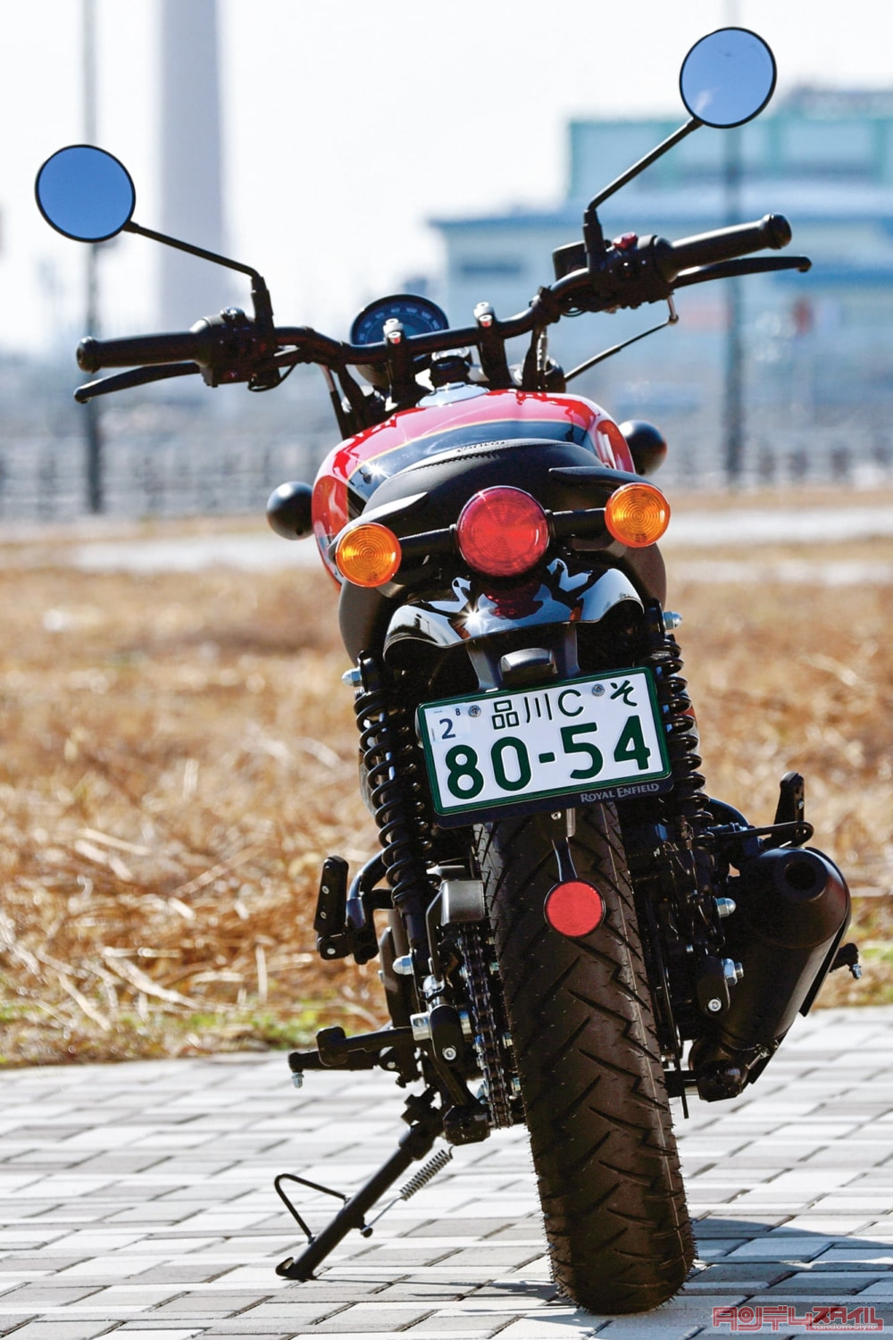 古い国産車をベースにしたカスタムシーンでは、ホイールサイズを前後17インチ化するメニューが定番になっている。より現代的なハンドリングやタイヤの選択肢を増やすのが主な目的。もちろんホイールを装着すればいいわけではなく、車体姿勢やサスペンションの見直しもともなうが。そういう意味では今回のハンター350はメーカー純正カスタムといったところ。こう書くと‟スポーティなモデルˮと思う人もいるだろうが、扱いやすさを重視しているので、気負うことなく街中を走り回ることができた。