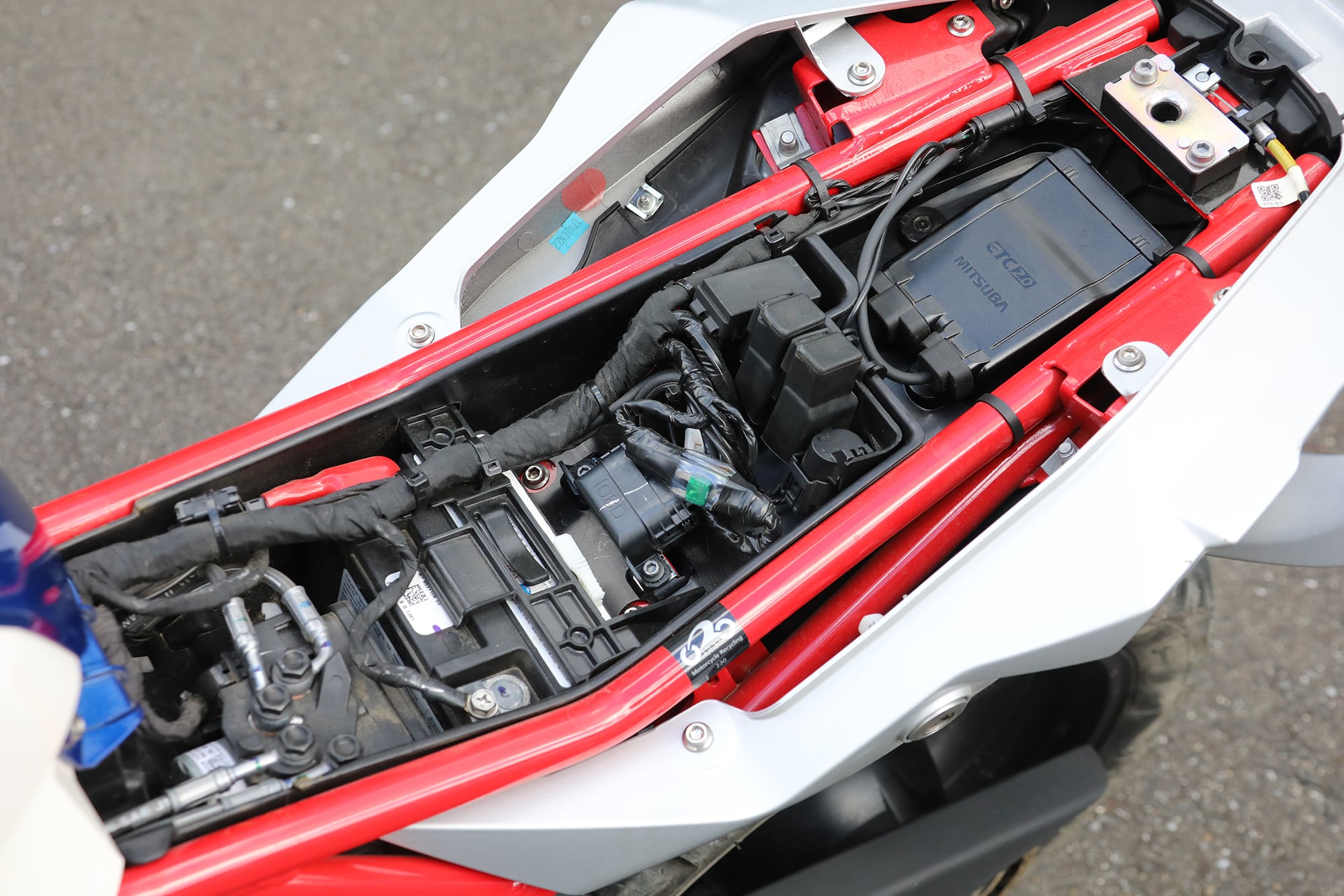 - シートはメインキーのみで工具を使うことなく取り外せて、シート下後方にちょっとした小物入れがあり、そこにはETC車載器が配備できる。バッテリーへのアクセスもラク
