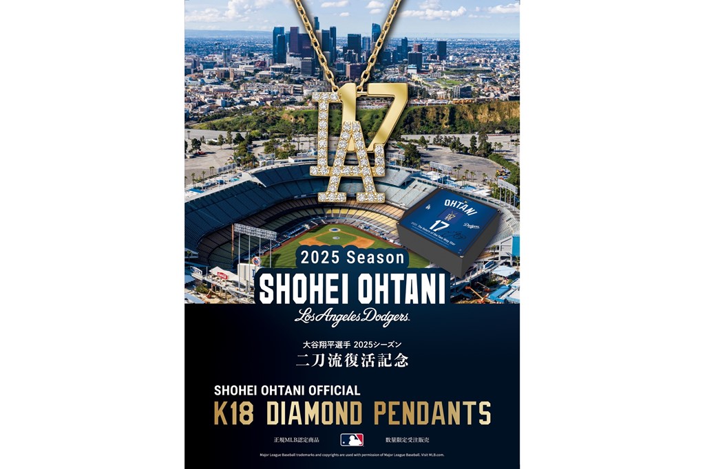 そんな新たな二刀流スーパースター伝説の幕開けとなる2025シーズンを記念して、今与だけのオフィシャルコラボレーションジュエリーが誕生した。ダイヤモンドで象った「LA」のメインロゴの背景に、大谷選手の代名詞である背番号「17」を重ねた、打者・投手としての二刀流復活を象徴するデザイン。専用ケースには、ゴールドMLBロゴがプリントされている。大谷翔平選手2025シーズンのホームラン数<55本>と勝利数<1勝>にちなんだ、560個の数量限定での展開である。