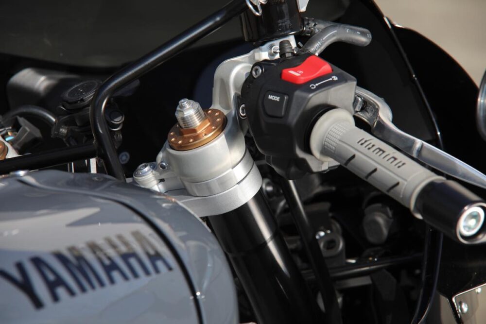 ライディングポジションの前傾度合いをゆるめ、楽な姿勢で乗れるようにハンドルとフロントフォークブラケットの間にヤマモトレーシングのハンドルアップKitを装着。10㎜グリップの位置が高くなった。