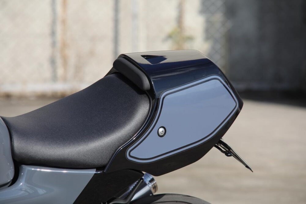 シングルシートカバーを用いてスポーティな雰囲気を高めている。こちらもアンダーカウルと同じワイズギア製。ゼッケンプレートふうなステッカーを別途制作し貼り付ける一工夫に作り手のセンスを感じる。