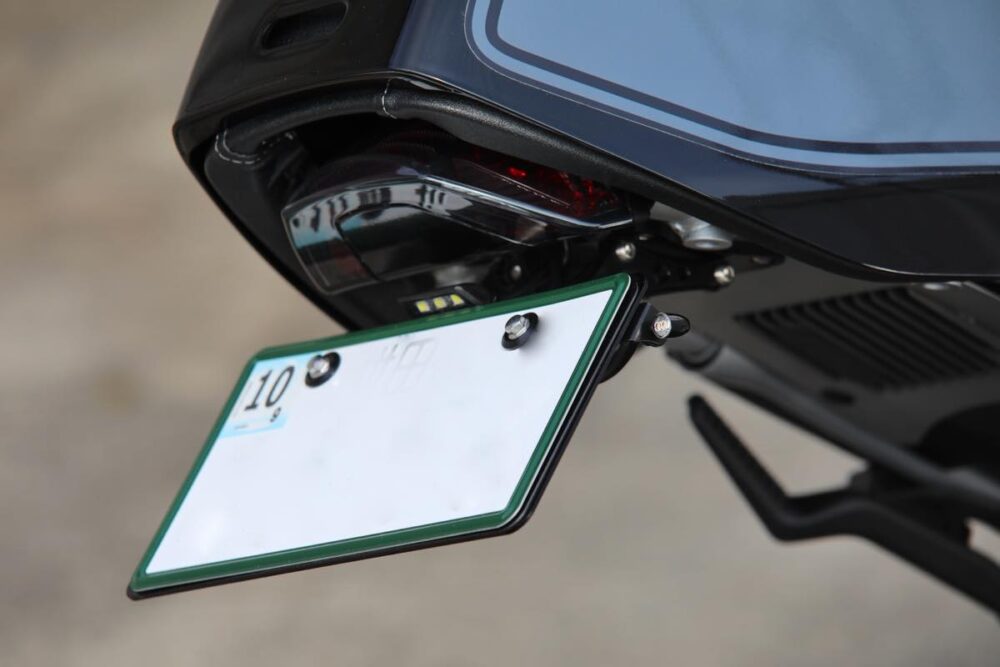 YMCK製のフェンダーレスキットと極小のLEDウインカーランプでテールまわりをスッキリとさせている。ナンバープレート横に飛び出している小さいバーツがウインカーランプ。キジマ製だ。
