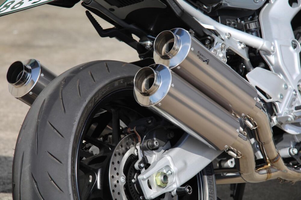 アンダーカウルとシングルシート、フェンダーレス処理が、より80年代のレーシングマシンらしさを強調する。そして、強いこだわりもって開発された3本出しのマフラーが圧倒的な存在感を見る者に与える。