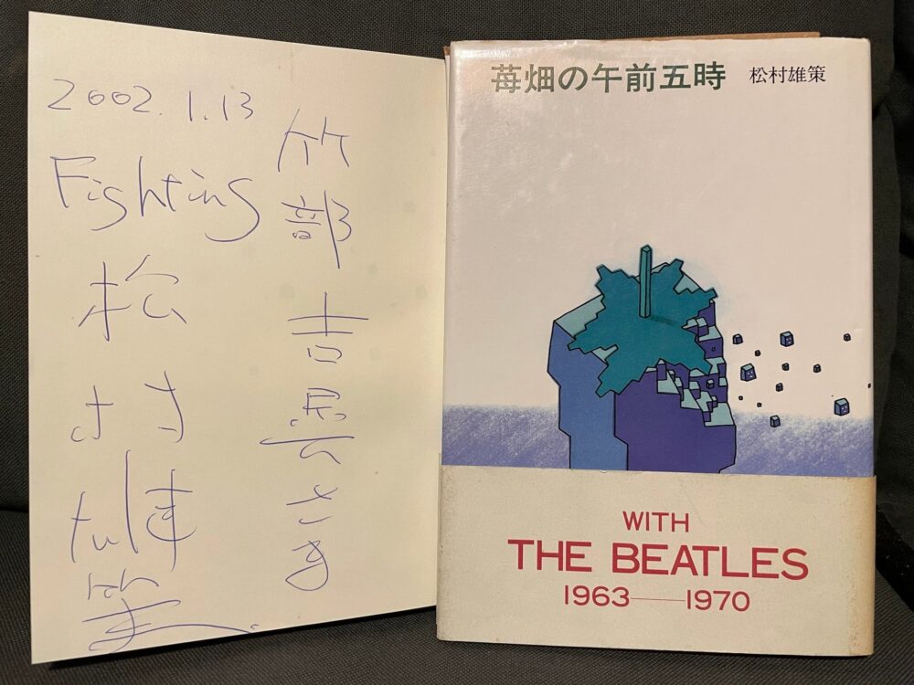 それからさらに数年時が流れて2000年代に入ったあたりの頃、仕事を通じて何度か松村さんにお会いする機会に恵まれた。お互い応援していたバンド、COILのライブでお会いすることが多かったのだけど、そのたびにビートルズ話に花を咲かせた。自分の好きな作家とビートルズの話をする、これ以上ない至福の時間を何度か持つことができたのは感動の極みである。あるとき、酒席の場で、持参した『苺畑の午前五時』に「サインをもらえますか?」とお願いしたら「いいよ」と快諾して表紙裏の白いページにサインを書いてくれた。86年から愛読していた小説に16年の時を経て著者のサインが入った瞬間に感動したことは言うまでもない。今思えばその時間はちょうど午前5時だったような気もするが、そこに松村さんがひと言記したFightingの理由については、墓場まで持っていかなければならないのではないかと思っている。