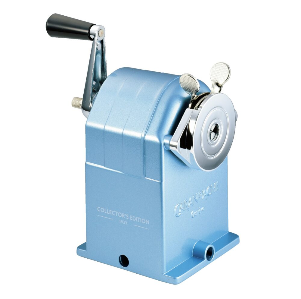 コレクションの世界観を取り入れた、限定色のメタルシャープナー。1933 年発売のレトロなデザインに、氷河を思わせるクールなブルーのコーティングが映える。直径4〜10mm の色鉛筆、ワックスパステル、鉛筆に対応。側面には「コレクターズ エディション」の文字が入り、限定モデルならではの特別感を演出している。