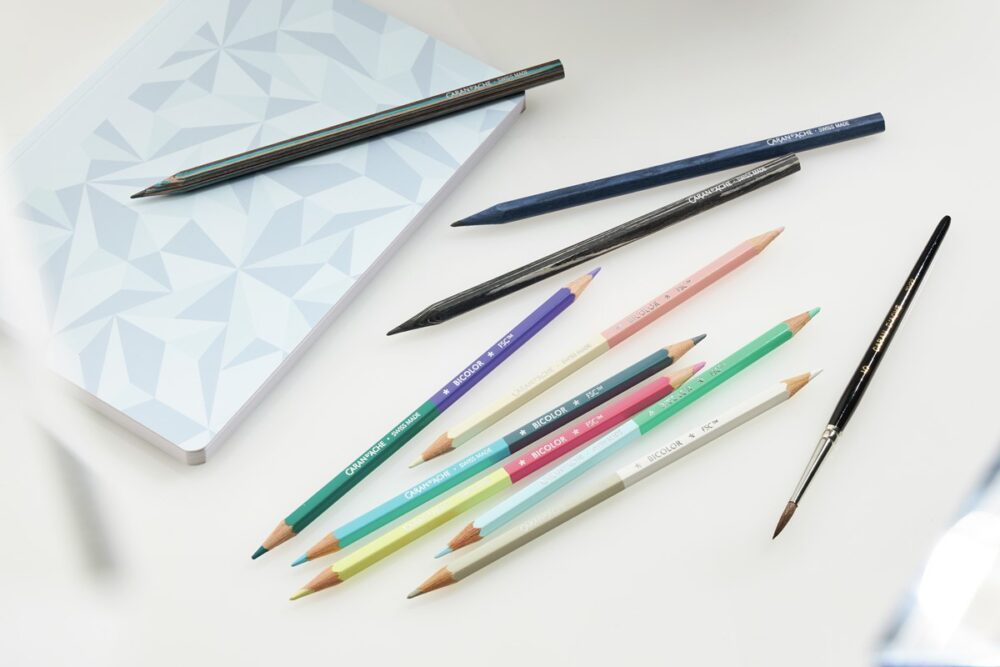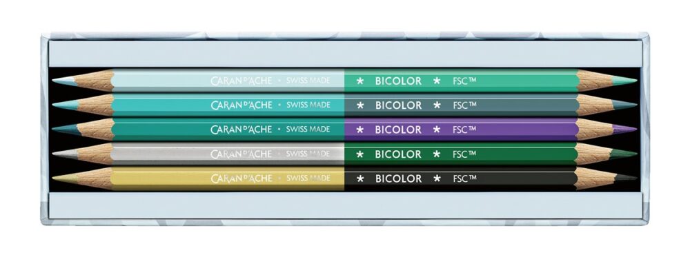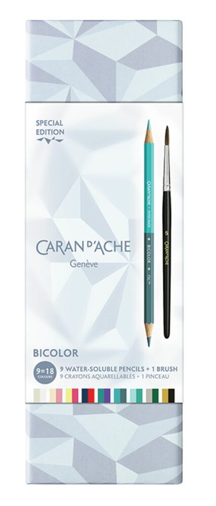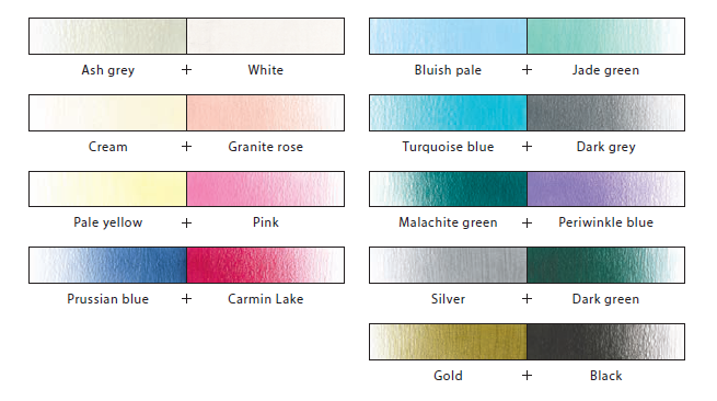 両端にそれぞれ異なる色を配した、バイカラー仕様の水溶性色鉛筆セット。素材にはシダーウッドを使用している。ホリデーシーズンにぴったりの優しい色合いから、作品に華やぎを添えるメタリックカラーまで、幅広いラインアップが揃った。計18 色をコンパクトに携帯できるので、外出先でも気軽に色彩豊かなスケッチが楽しめる。