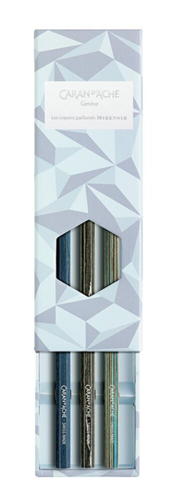 スイスで創業したフレグランスブランド「ミゼンジール」とコラボした鉛筆セット。まず目を奪われるのは、寒色系のトーンで彩られた美軸だ。そして驚くべきは、その軸に香りが宿っているということ。カーネーション、ジャスミン、ピンクペッパー、クローブをブレンドした香りは、書く時間に特別なムードを添えてくれる。