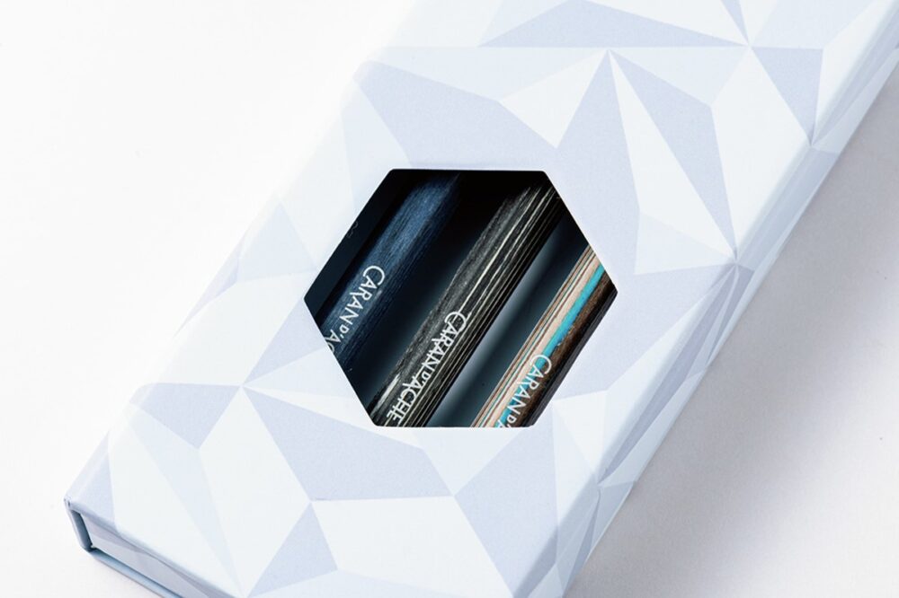 天冠部には、鉛筆工場をルーツとするカランダッシュのシンボル「ヘキサゴンマーク」が、さりげないアクセントとしてあしらわれている。