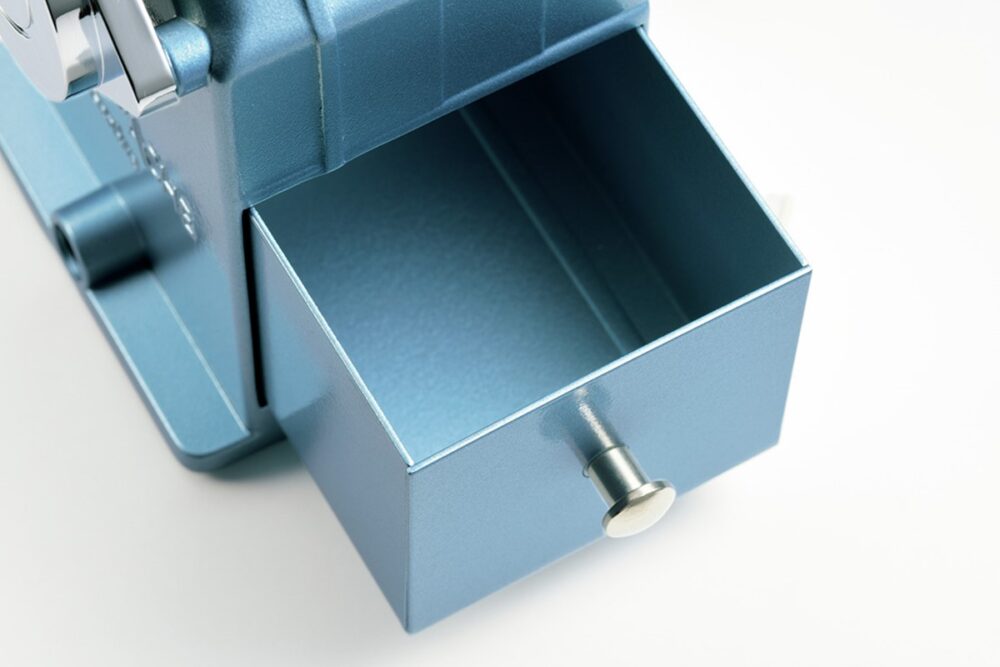 削りカスがたっぷりと入る引き出し式のケース。内部も同色のブルーで統一されている。大きく開くため掃除もしやすい。