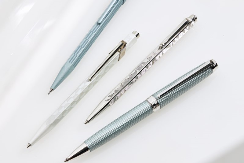カランダッシュを代表する「849」コレクションの限定作。ボールペンとメカニカルペンシルは、きらめく霜や氷にインスパイアされたデザインで、ホリデーシーズンの高揚感を引き立ててくれる。アルミニウム製ボディの手触りはつるりとした質感で、軽量かつ耐久性も高い。手に取れば六角軸が自然と手にフィットする。