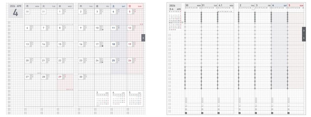 月の予定を一覧できる「月間ブロック」ページと、24時間軸を採用した「週間バーチカル」ページを搭載。TODOリストやメモを書き込めるスペースも備え、日々の情報整理をスムーズに行える。