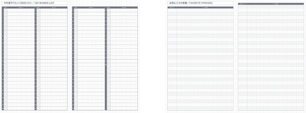 一年を見通し、自分の生き方を見つめ直せる「今年度やりたい100のリスト」や、心に残った大切な言葉を記録できる「お気に入りの言葉」など、ライフログとして使えるユニークなページも用意している。