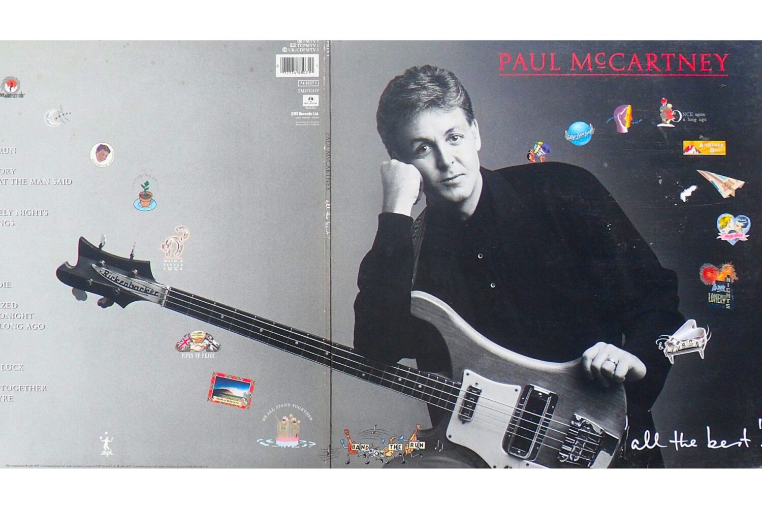 微妙だったデザイン(女神像をスイスのアルプスの雪山に持って行って撮影したというが)『ウイングス・グレイテスト』(封入されていたポスターはうれしかった)に比べると、『オール・ザ・ベスト』はデザインのこだわりを随所に感じさせ、なにより、ジャケットに本人が映っていることがうれしかった。短髪に黒のスーツを合わせた出で立ちが白黒写真とマッチしているほか、久々に登場したリッケンバッカー、ウイングス時代を象徴するベースの登場はたまらないものがあった。ポールのまわりに散っているイラストも気が利いていてかわいいものが多い。