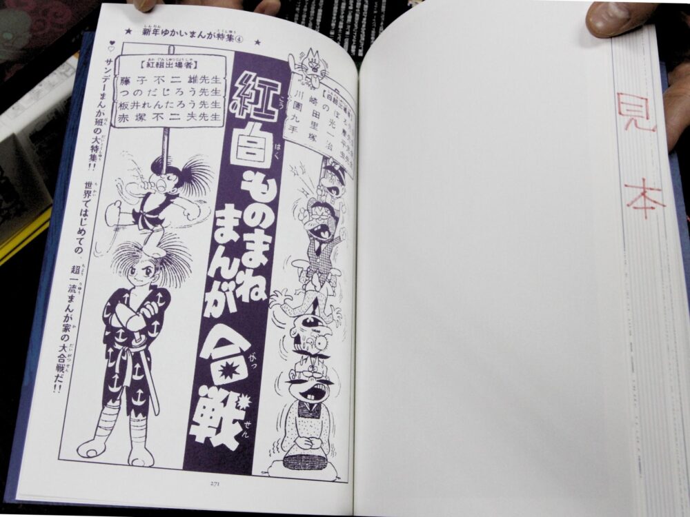 この「紅白ものまねまんが合戦」という企画ページは、赤塚不二夫先生、藤子不二雄先生(FとAに分かれていない時代です)など各先生のプロダクションに許可を得て掲載することができました。ここでしか読めない貴重なものだと思います。