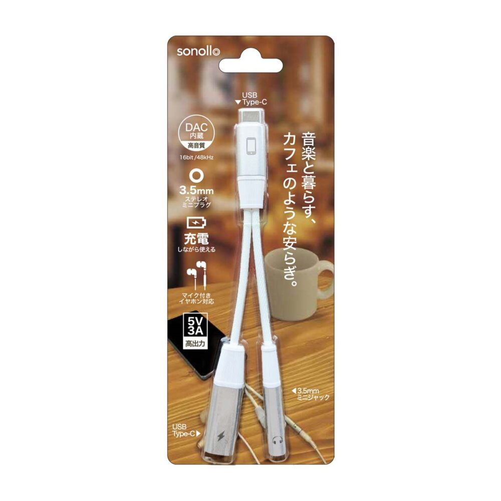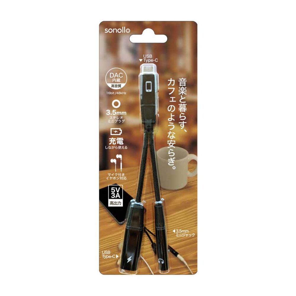 「Sonollo」は、USB Type-C端子を3.5mmイヤホンジャックへ変換するDAC内蔵アダプター。3.5mm端子に加え、充電専用のUSB Type-C端子を備え、音楽を楽しみながらスマートフォンの充電が可能だ。USB充電が利用できるカフェや喫茶店で、読書や勉強をしながら音楽を聴きつつ充電する——そんな“音楽と暮らす時間”を快適に支える。