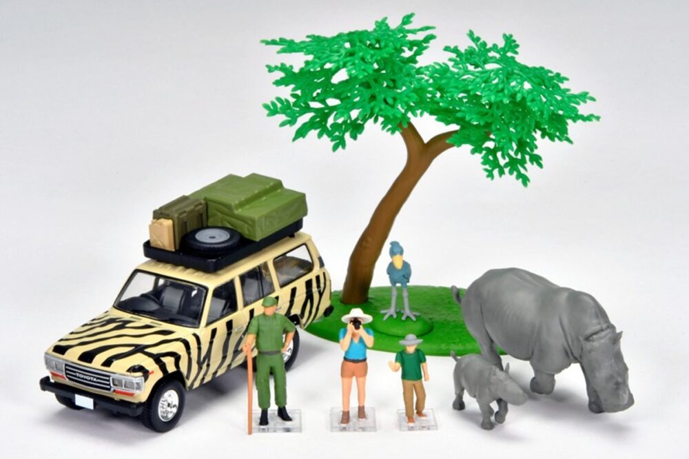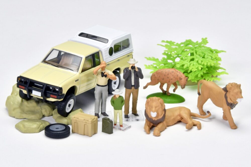 「海洋堂×トミカリミテッド ヴィンテージ ジオコレ64 #カースナップ」は、株式会社海洋堂監修のフィギュアと、1/64スケールで統一されたトミカリミテッド ヴィンテージのミニカーをセットにした情景再現シリーズである。サファリをテーマに、リアリティあふれるミニカーと動物・人物フィギュアを組み合わせることで、自分だけの情景を作り込み、写真撮影を楽しめる点が特長だ。