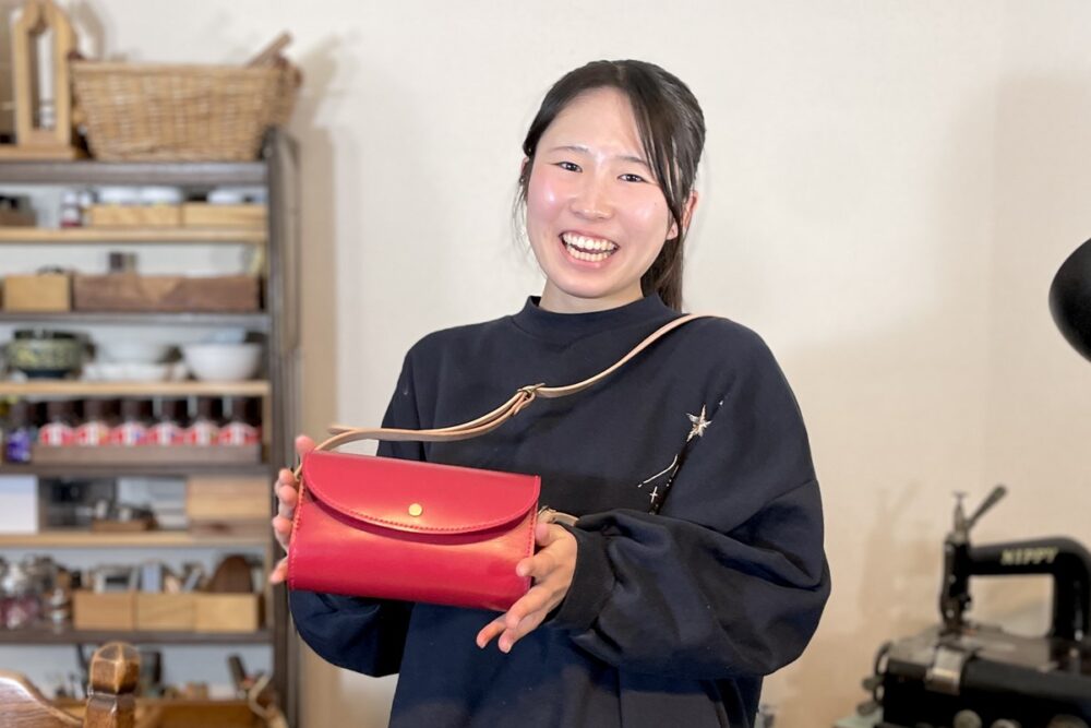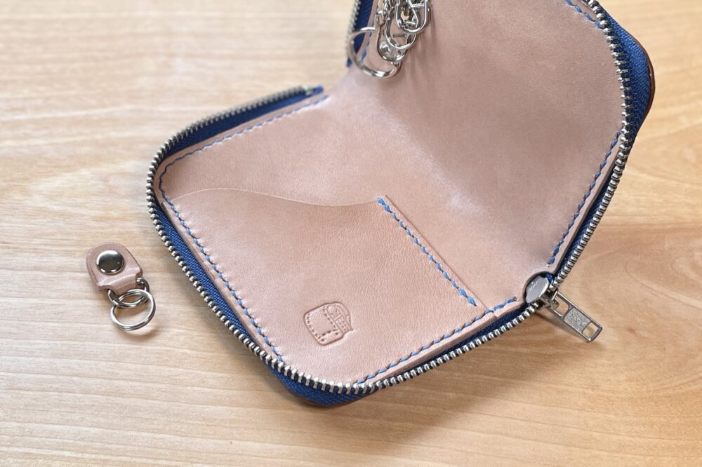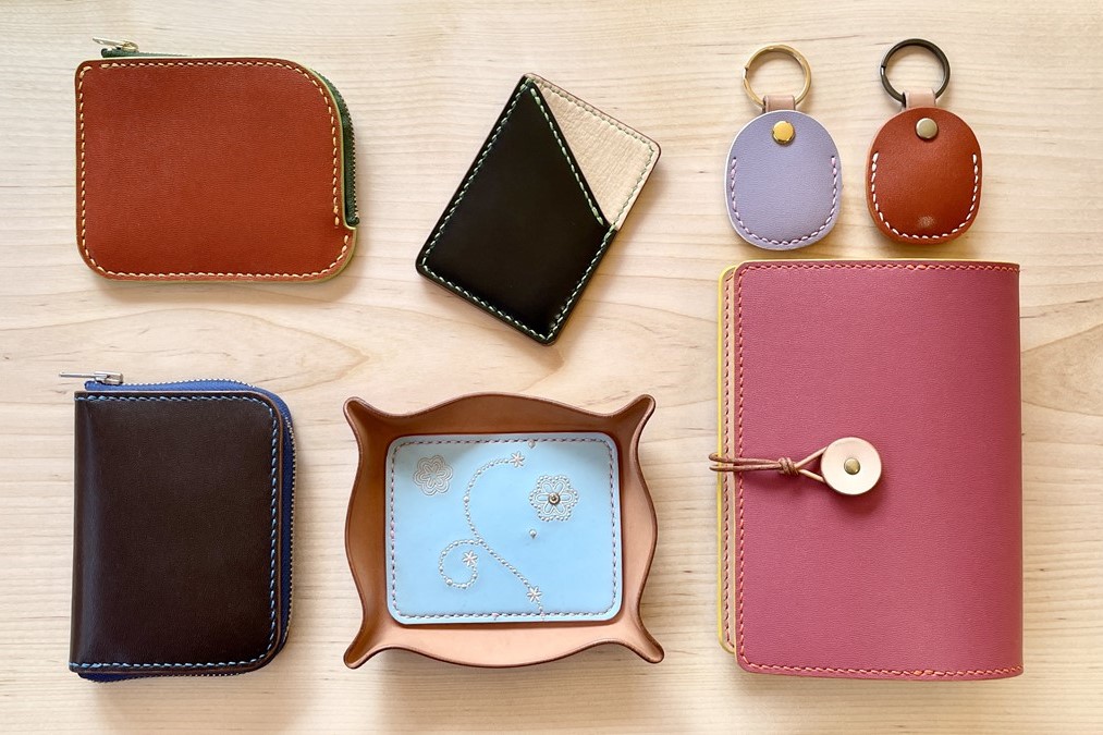 ショルダーバッグからお財布やキーホルダーなどの革小物まで、体験もオーダーも全11種類から選べる。リネン糸・金具・切り口の色の組み合わせや刻印により、自分だけのカスタムを楽しむことができる。お財布やキーケースなどの内装は、だんだん飴色に経年変化する国産のヌメ革を使って仕立てている。